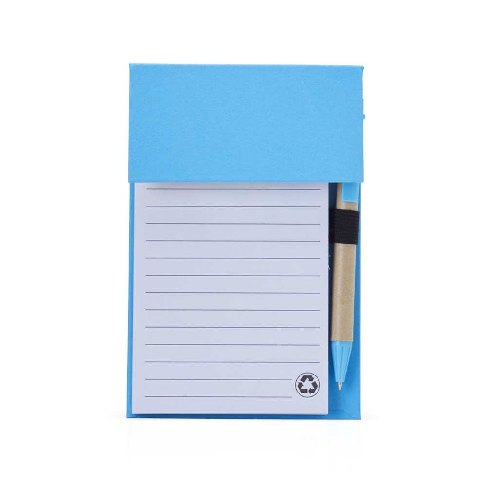 Bloco de anotações ecológico com caneta, feito em kraft com 6 blocos autoadesivos coloridos com aproximadamente 20 folhas e bloco com aproximadamente 100 folhas brancas com pauta. Possui porta caneta elástico e acompanha caneta de papelão e detalhes plásticos, carga esferográfica azul 1.0mm e acionamento por clique.