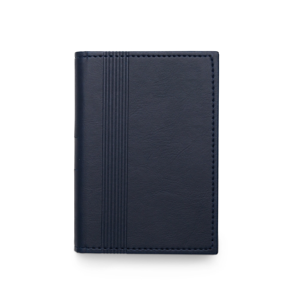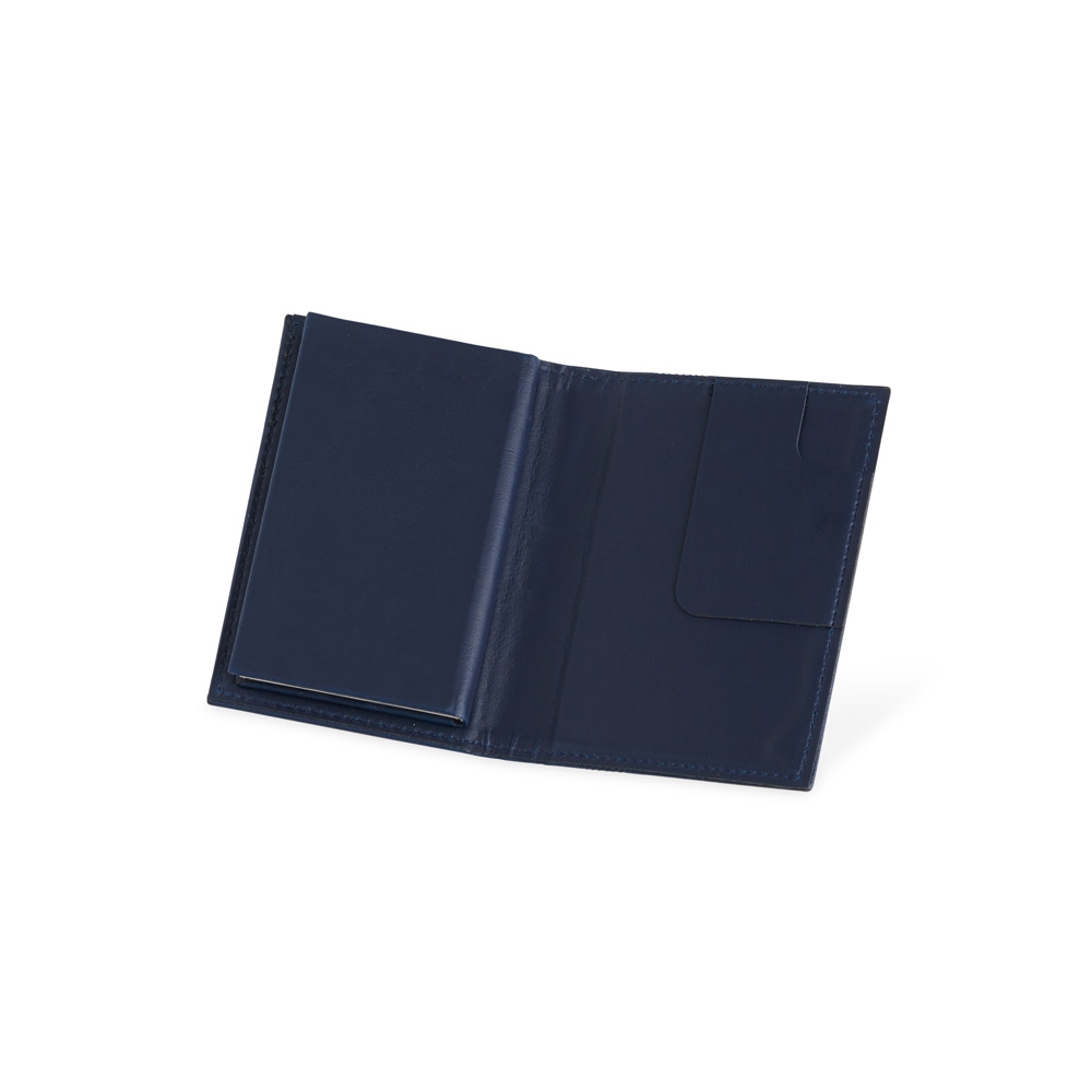 Bloco de anotações em couro sintético com porta caneta e compartimento para arquivar folhas. Possui aproximadamente 80 folhas marfim sem pauta.
