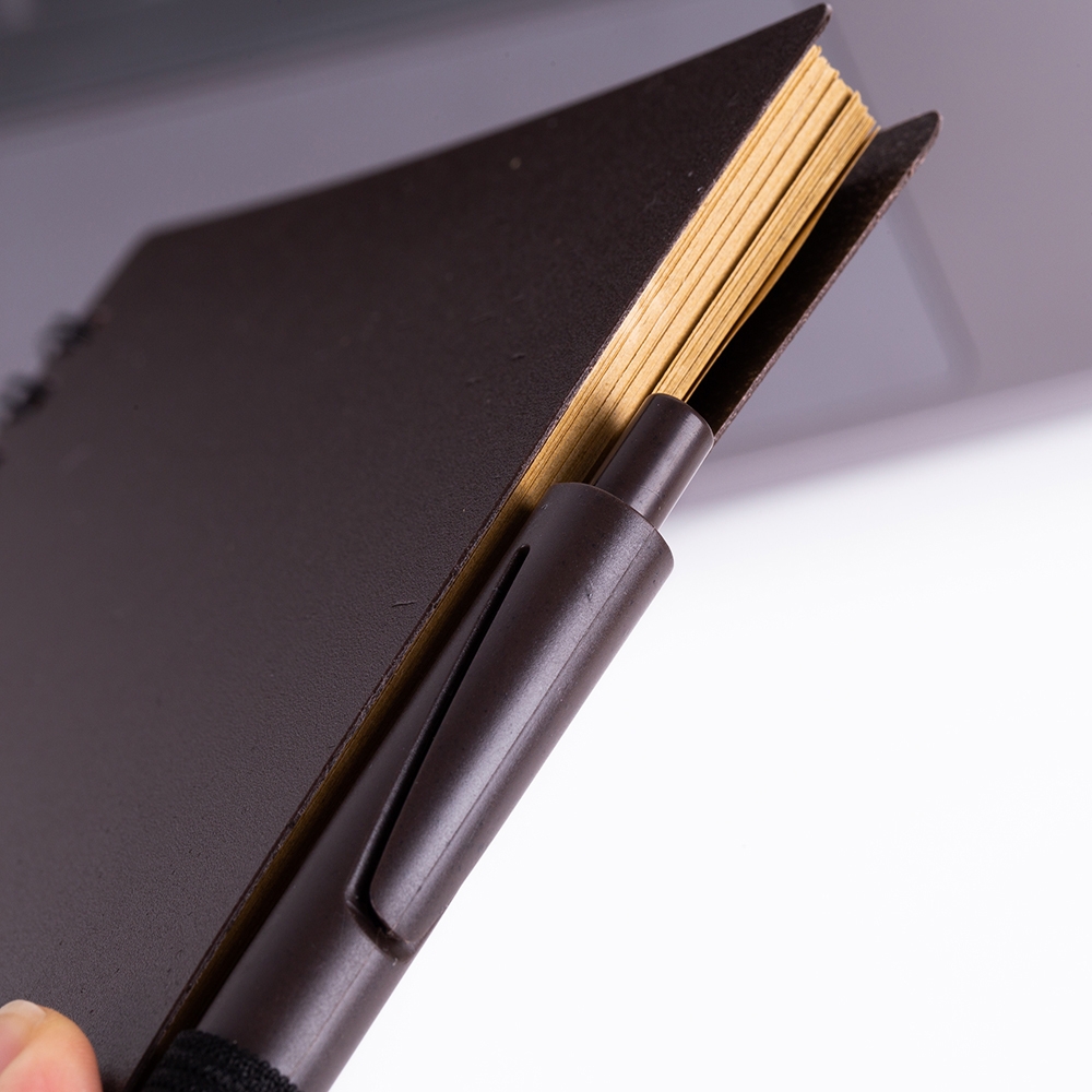 Bloco de anotações ecológico com caneta plástica: Bloco de anotações com elástico e suporte para caneta, produzido com grãos de café e polipropileno, aproximadamente 70 folhas marrons com pauta, caneta plástica com acionamento por clique.