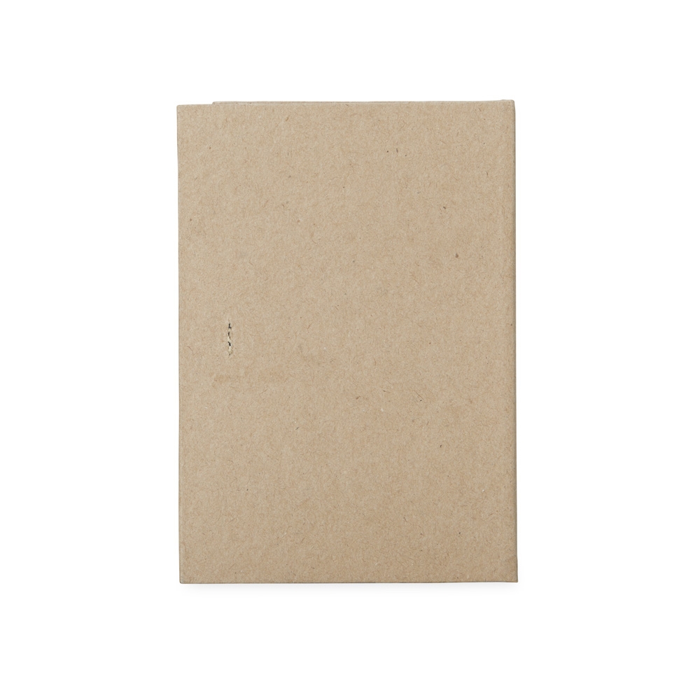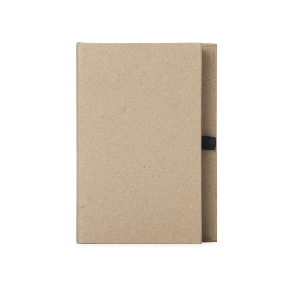 Bloco de anotações capa dura em kraft com porta caneta e wire-o. Contém aproximadamente 100 páginas não pautadas na cor branca.