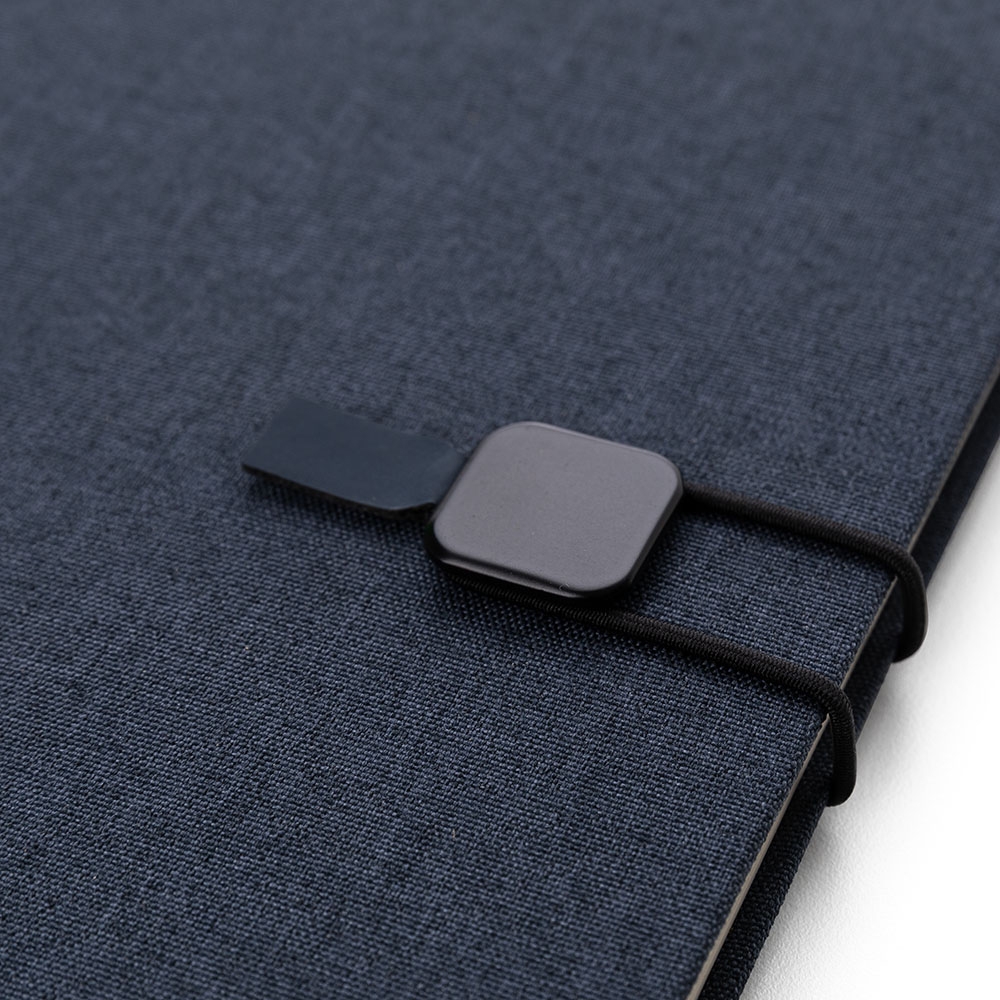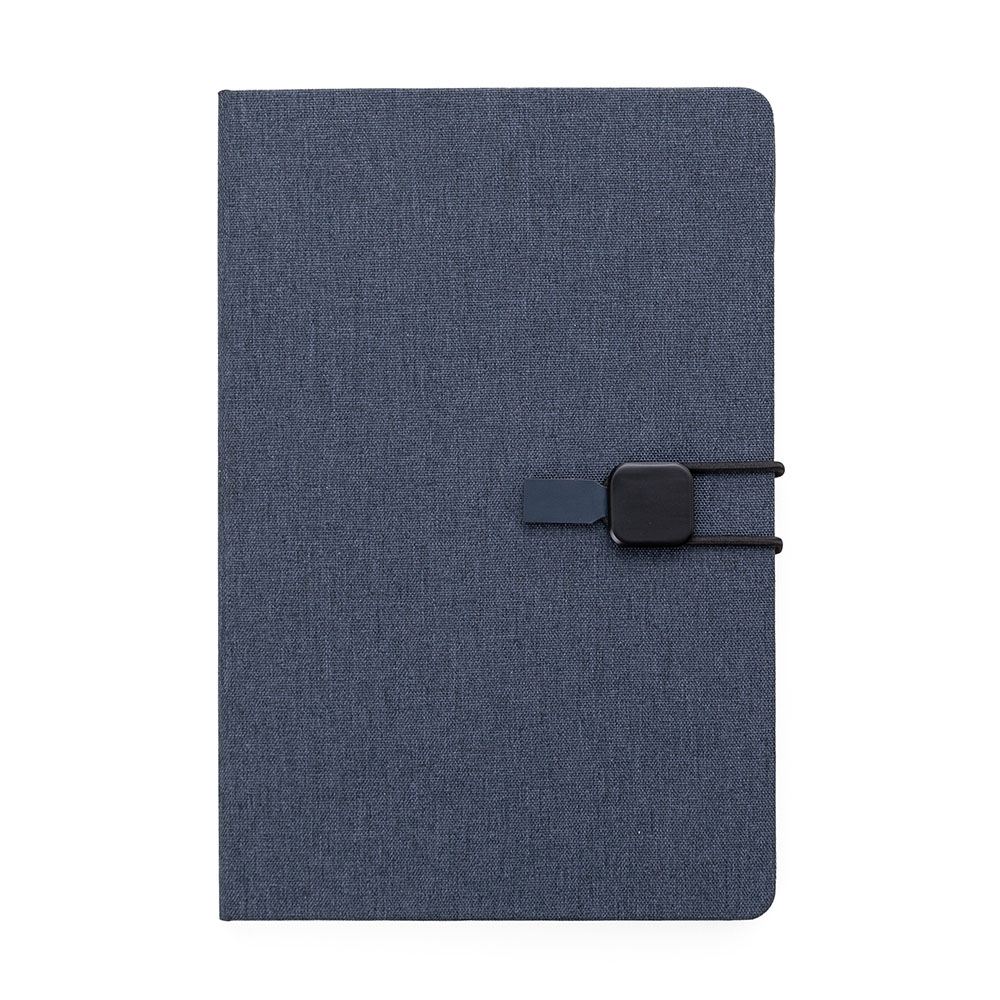 Bloco de anotações com capa dura em tecido de poliéster. Miolo com 80 folhas pautadas na cor bege. Possui elástico lateral com detalhe em couro sintético para fechamento do caderno.