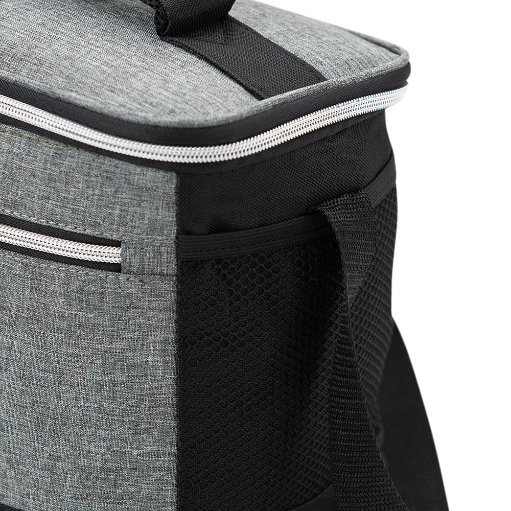 Bolsa térmica de nylon 10 litros com dois compartimentos e bolsos laterais em malha. Compartimento principal com revestimento térmico.