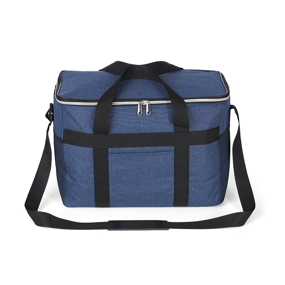 Bolsa térmica de poliéster oxford 300D de 33 litros com bolso frontal e bolsos laterais em malha.
