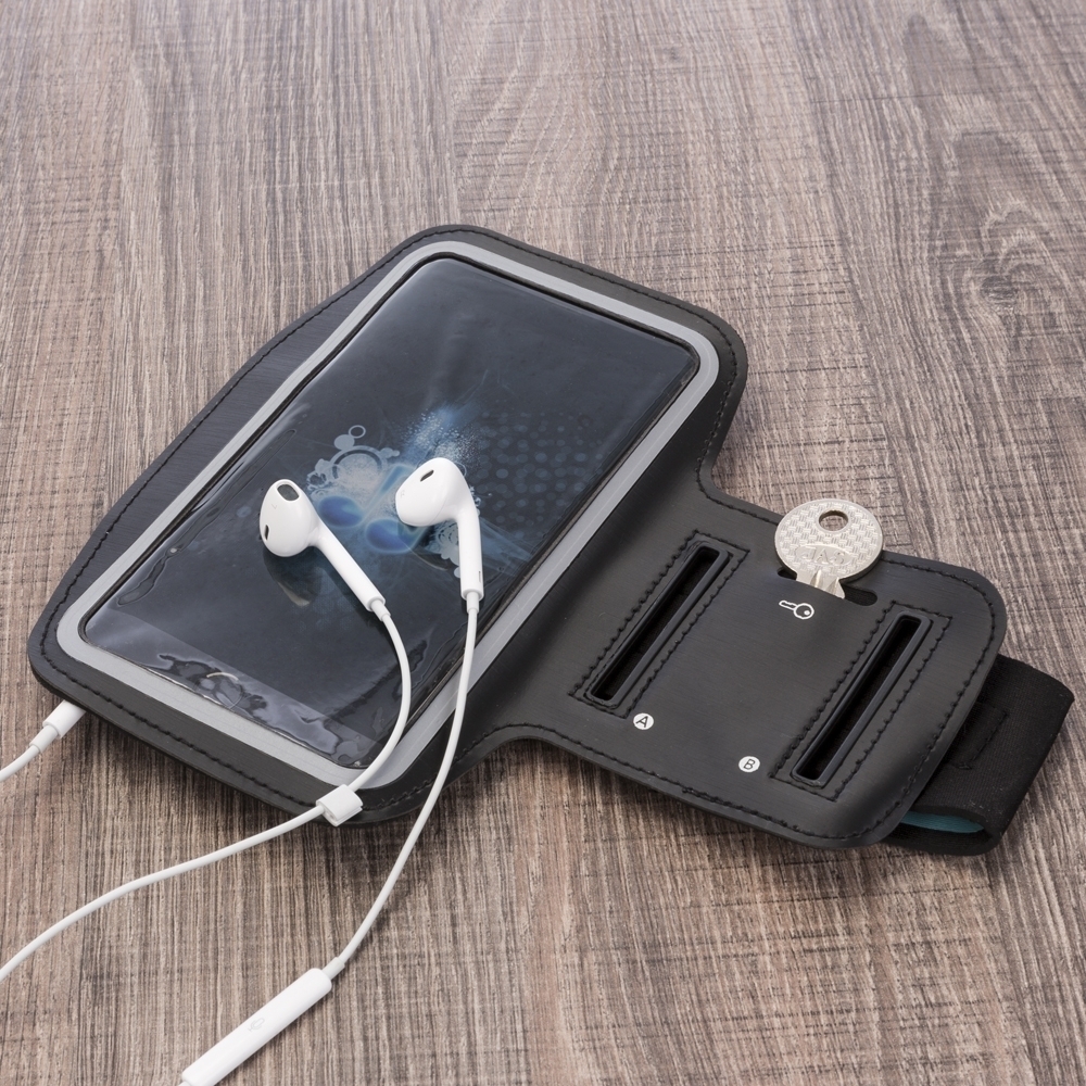 Braçadeira de neoprene com detalhe frontal em couro sintético. Visor plástico e contorno prata, possui bolso para chave, cinta de velcro regulável com posição indicativa na lateral(A e B). Possui contorno azulado no velcro, parte traseira possui 4 áreas vazadas para poder passar o fone de ouvido(também possuem contorno azulado).