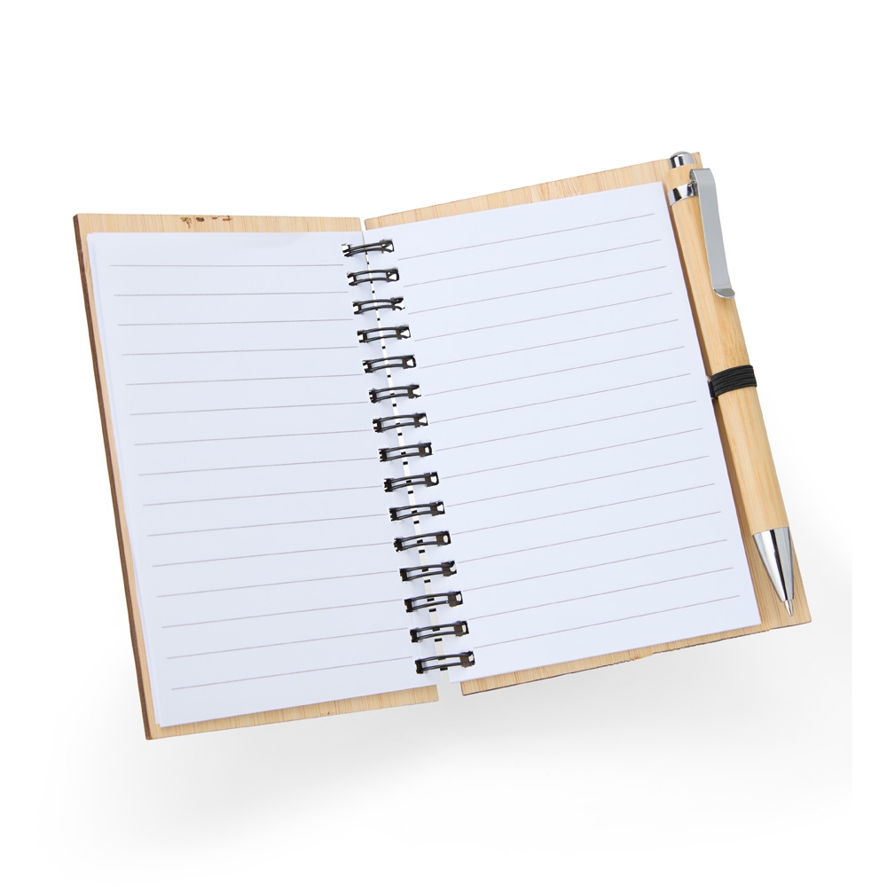 Caderneta ecológica com caneta. Capa de bambu. Possui aproximadamente 50 folhas brancas pautadas. Acompanha uma caneta de bambu com detalhes em metal.