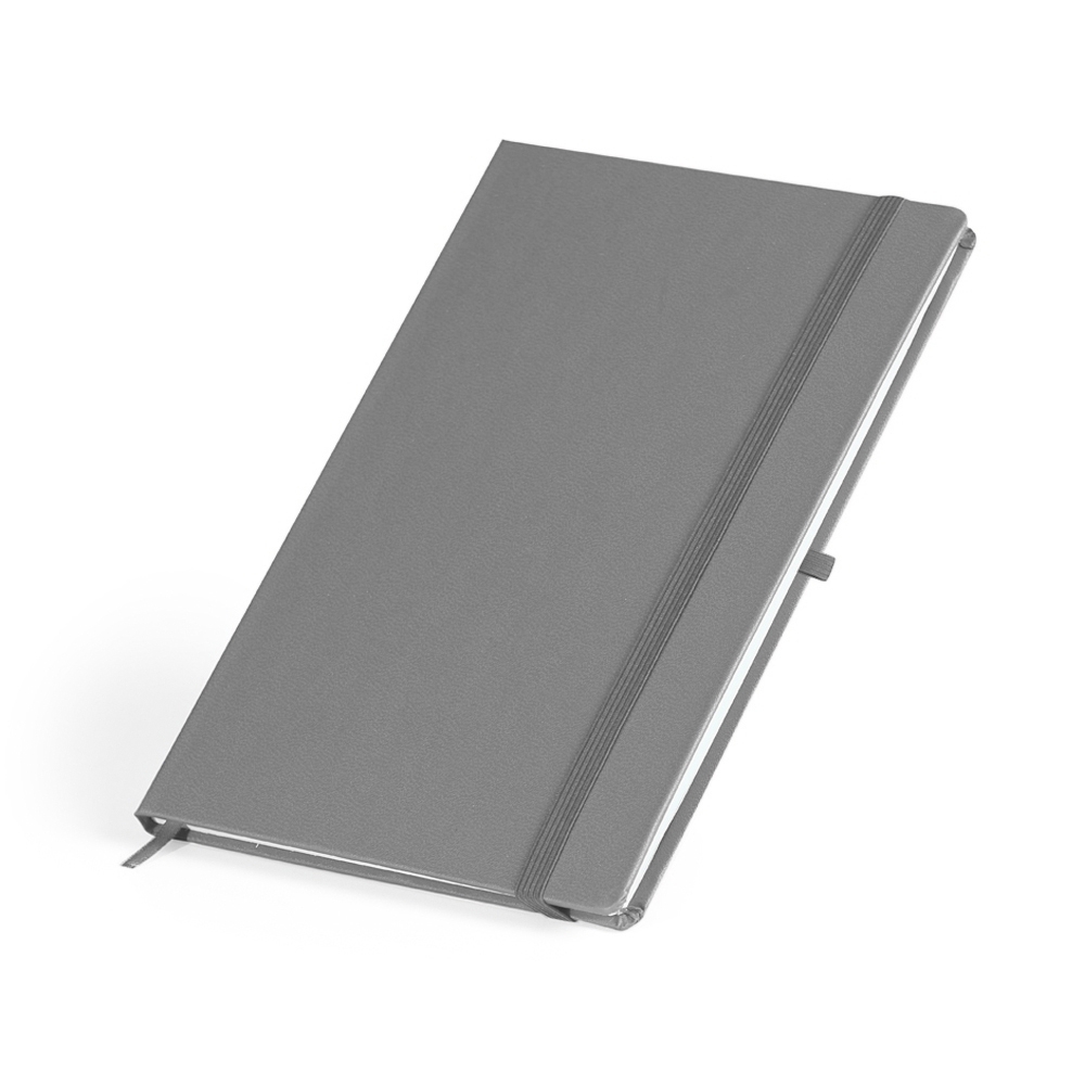 Caderneta em couro sintético com porta caneta, marcador de página em cetim e fita elástica para fechar. Contém aproximadamente 80 folhas com pauta.