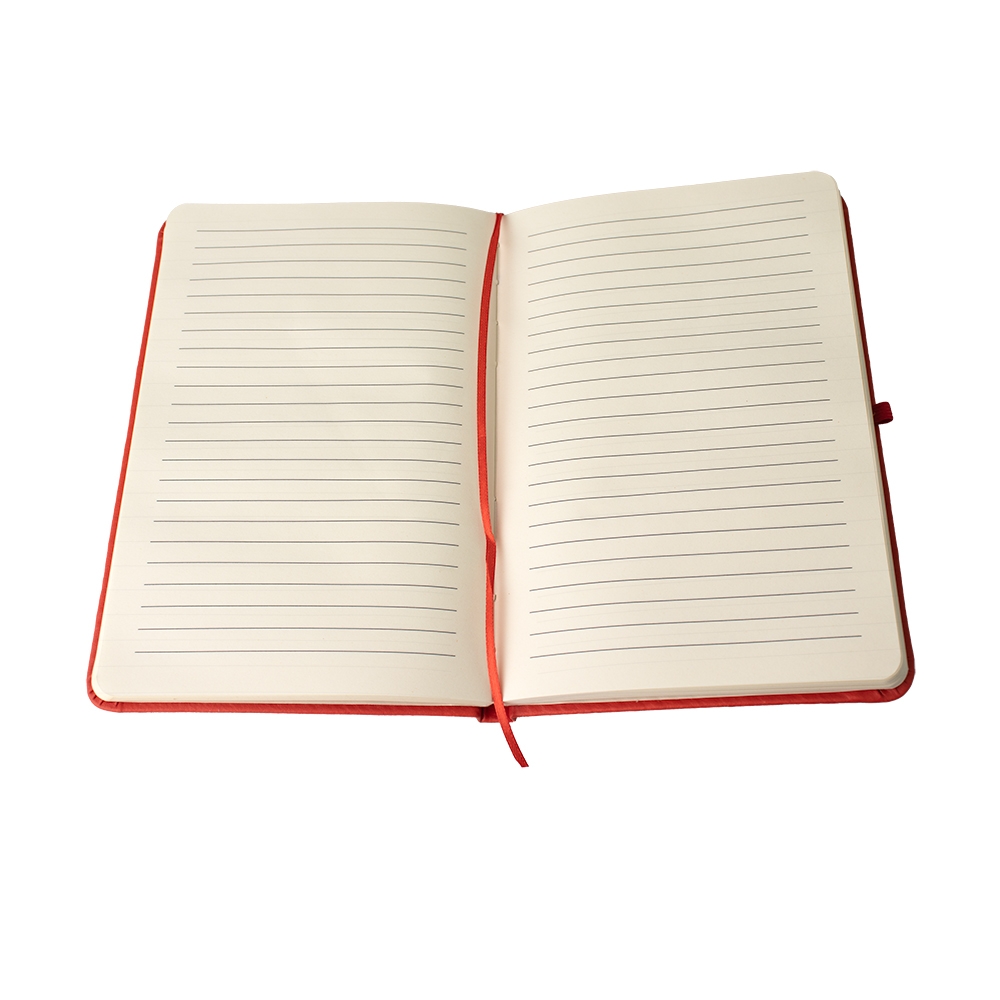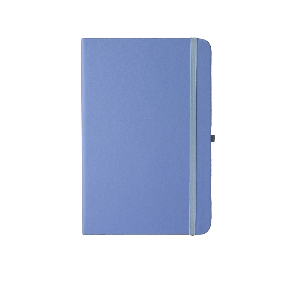 Caderneta em couro sintético com porta caneta, marcador de página em cetim e fita elástica para lacre. Contém aproximadamente 80 folhas pardas com pauta.