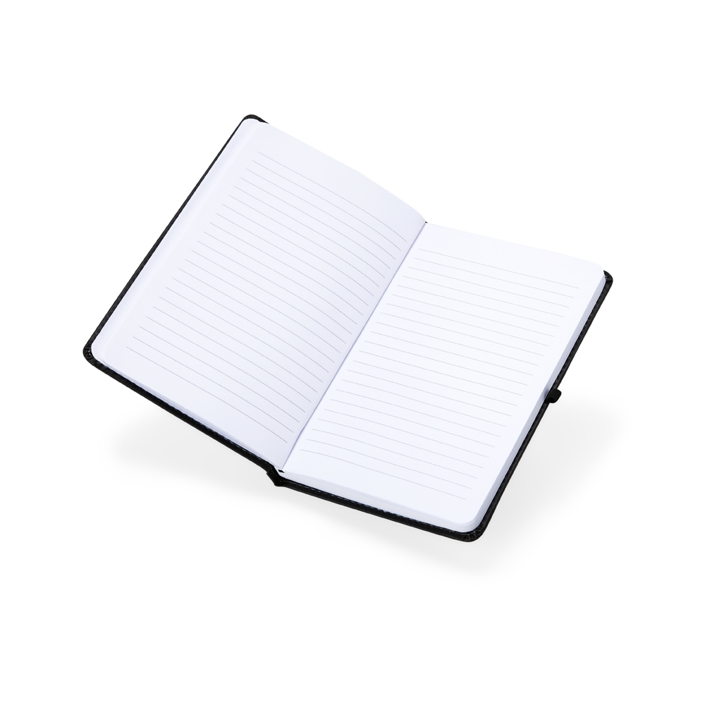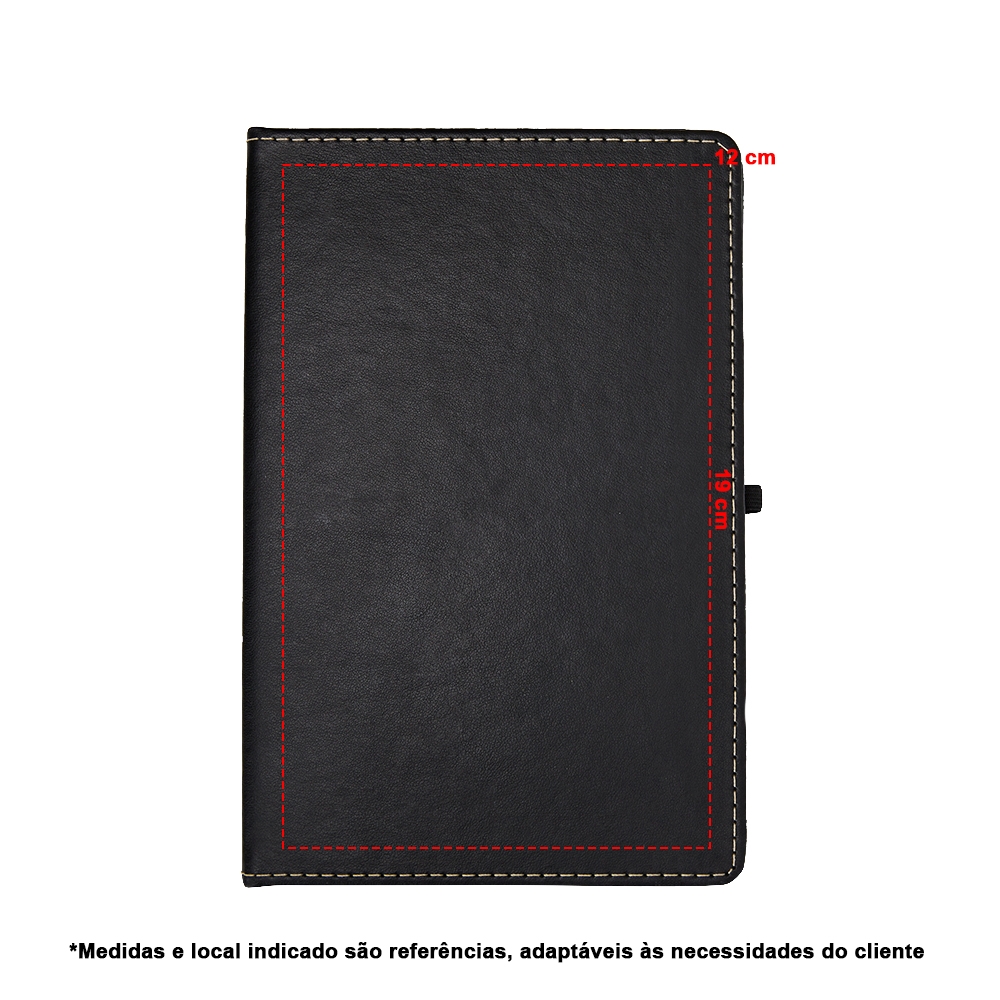 Caderneta em couro sintético com porta caneta, marca página em cetim e elástico para fecho. Contém aproximadamente 80 folhas brancas com pauta.