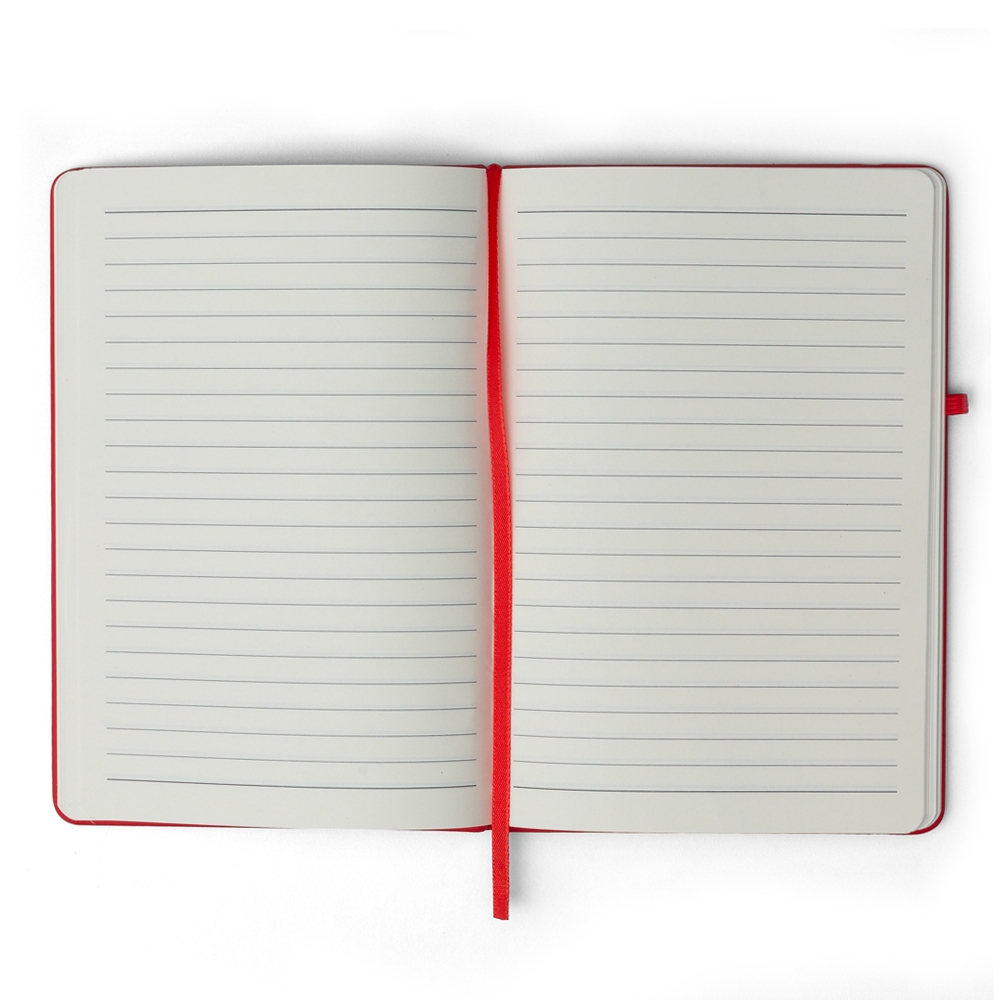 Caderneta emborrachada com porta caneta elástico em nylon, marcador de página em cetim e fita elástica de nylon para fechar. Contém aproximadamente 72 folhas pardas pautadas.