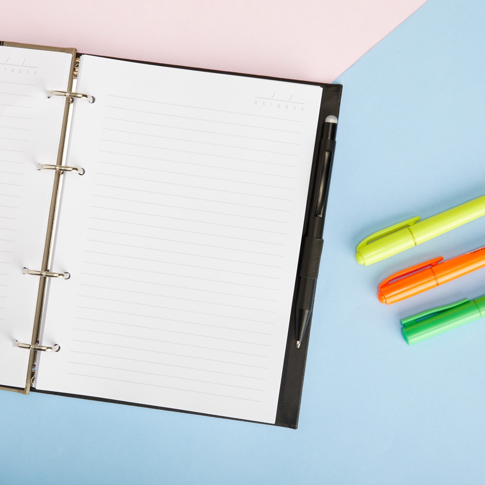 Caderno fichário em couro sintético. Possui suporte na lateral para caneta ( não acompanha) e aproximadamente 100 folhas.