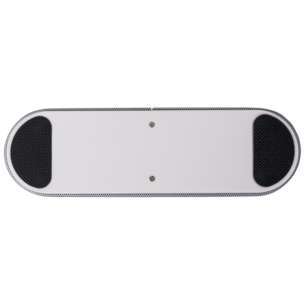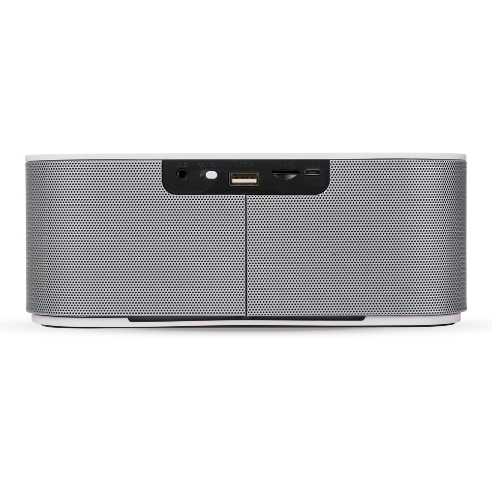 Caixa de Som Multimídia. Design fino e material plástico resistente, possui: botão On/Off no verso, botão > (MODE), botão < retroceder faixa ou diminuir volume, botão > avançar faixa ou aumentar volume, botão PLAY/PAUSE e atender chamadas, entrada P2/auxiliar(caixinha de som pode ser conectada no computador, basta segurar o botão central para alternar o modo), entrada microUSB, microfone, entrada microSD(cartão de memória) e entrada USB(leitura de pen drive), parte inferior possui borrachas anti deslizantes e auto-falantes laterais. Acompanha cabo USB.