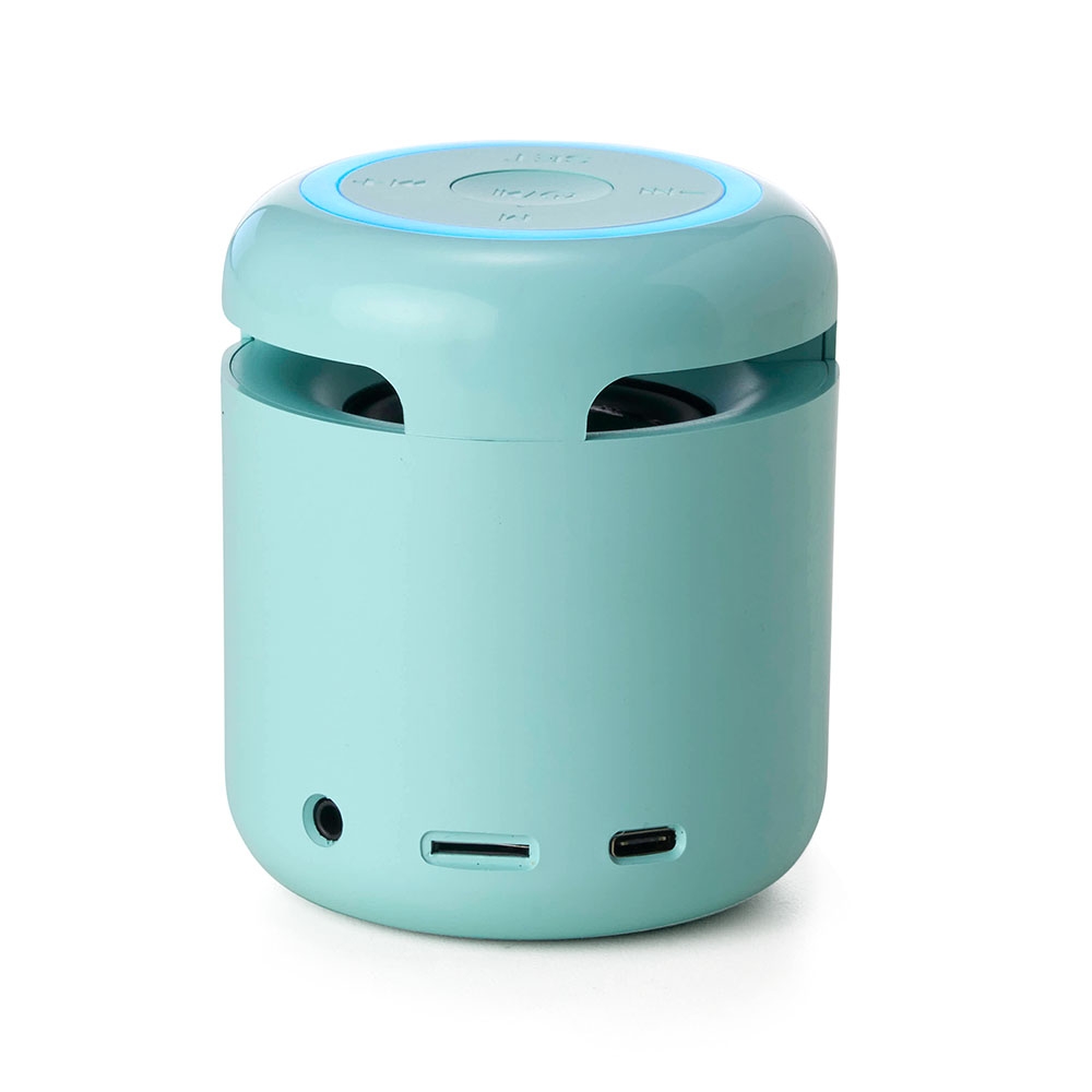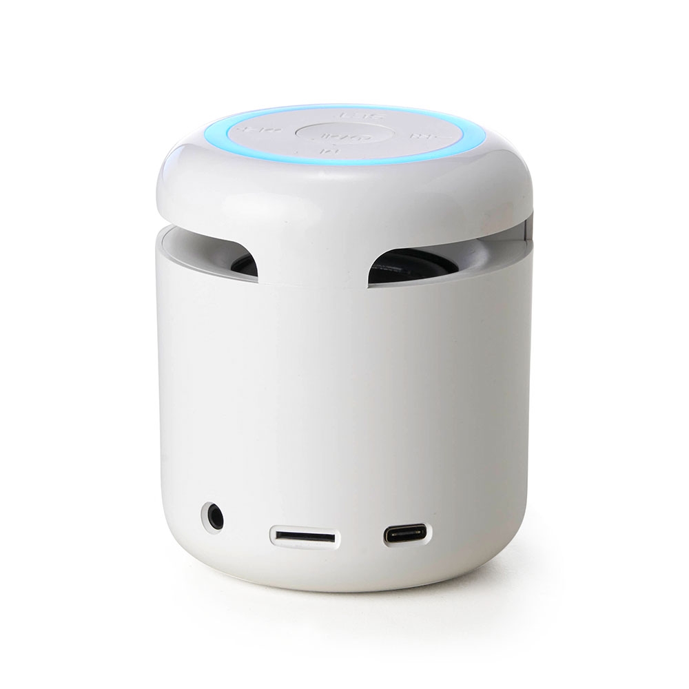 Caixa de som multimídia com relógio despertador. Produzida em plástico e com borrachas antiderrapantes na área inferior, a caixa de som tem bateria de longa duração, display de LED na área frontal, e anel de led brilhante na parte superior. A caixa de som executa nos modos bluetooth, rádio FM, cartão TF-microSD e entrada auxiliar P2. Acompanha cabo USB e manual em inglês e chinês.
