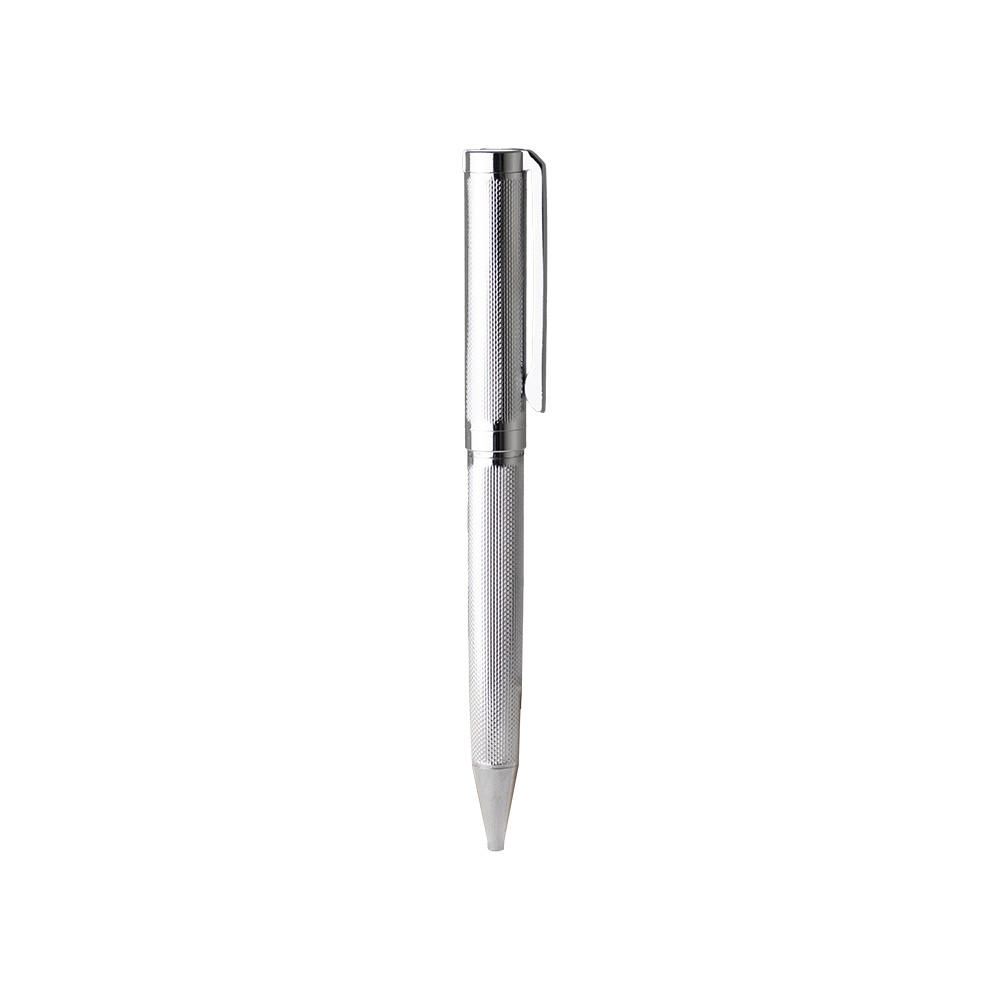 Caneta metálica com carga esferográfica azul 1.0mm e acionamento por rotação.