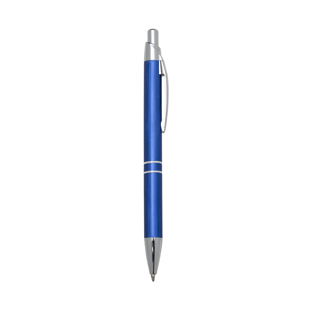 Caneta metálica com carga esferográfica azul e acionamento por clique.