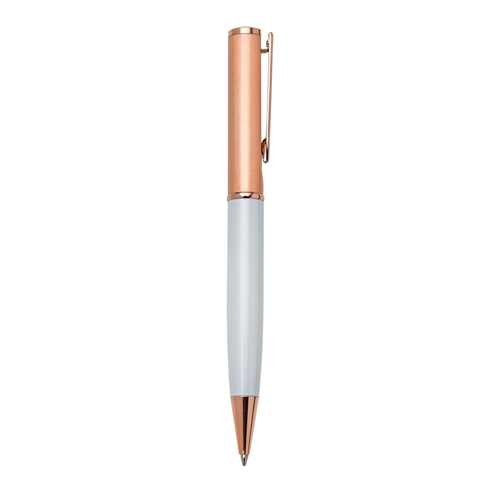 Caneta metal cobre com detalhe inferior colorido. Clip metal com e detalhe circular na ponta superior, possui anel central e aciona por giro. OBS.: PEDIDO APENAS MÚLTIPLO DE 50 PEÇAS!