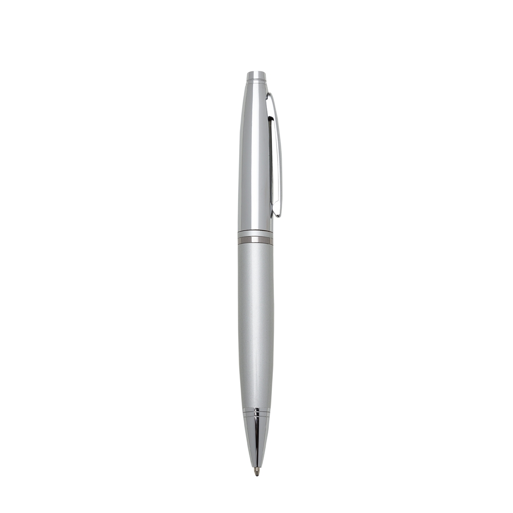 Caneta metálica com carga esferográfica azul e acionamento por rotação.
