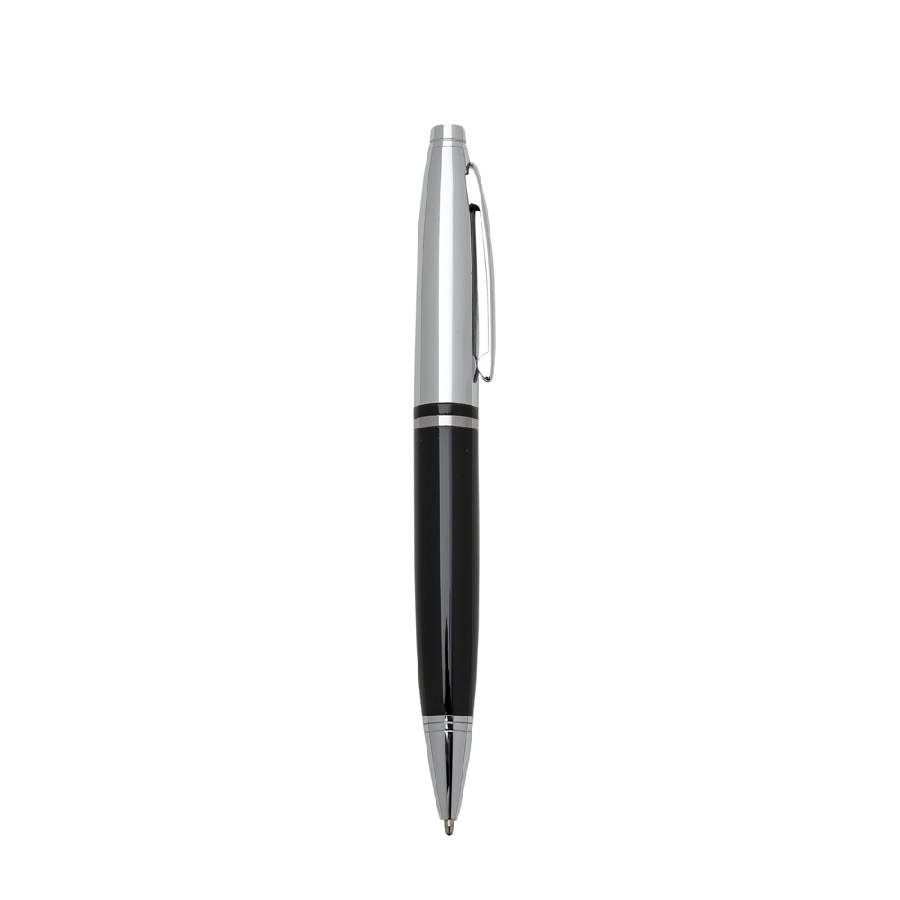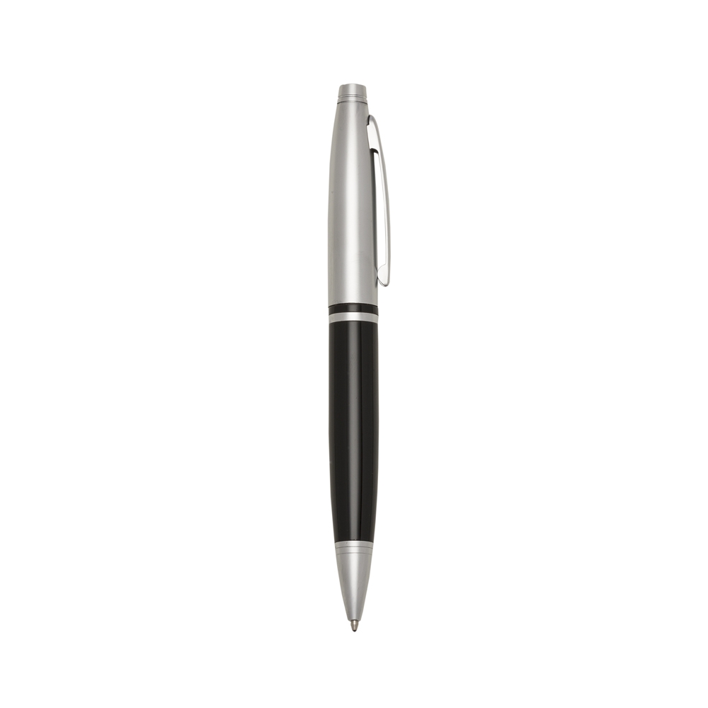 Caneta metálica com carga esferográfica azul e acionamento por rotação.