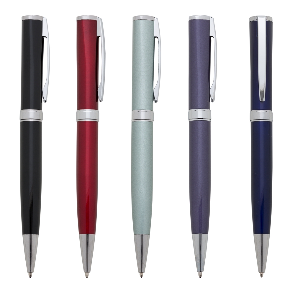 Caneta metálica com carga esferográfica azul e acionamento por rotação.