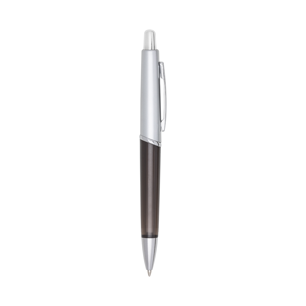 Caneta plástica com carga esferográfica azul e acionamento por clique.