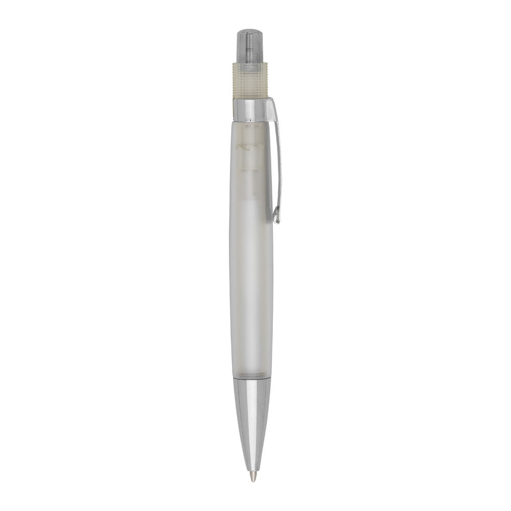 Caneta plástica com carga esferográfica azul e acionamento por clique.