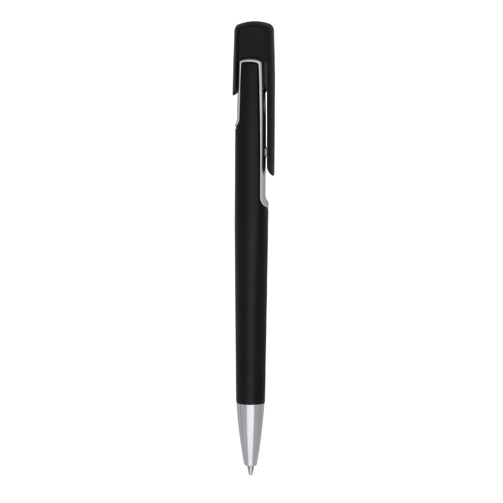Caneta plástica com carga esferográfica azul e acionamento por clique.