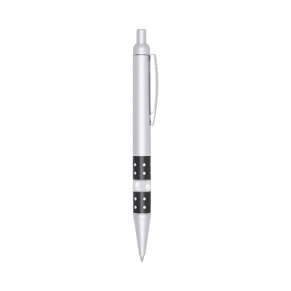 Caneta plástica com detalhe strass, carga esferográfica azul e acionamento por clique.
