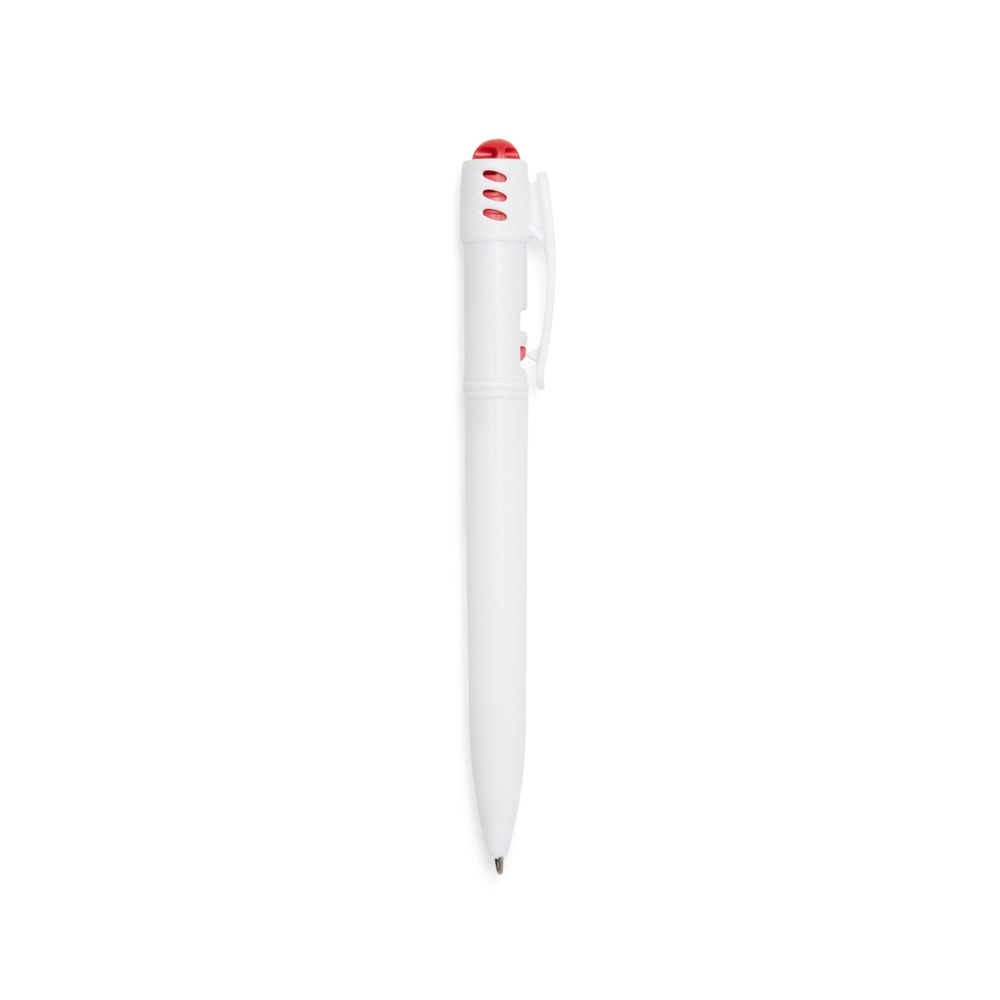 Caneta plástica com carga esferográfica azul e acionamento por clique.