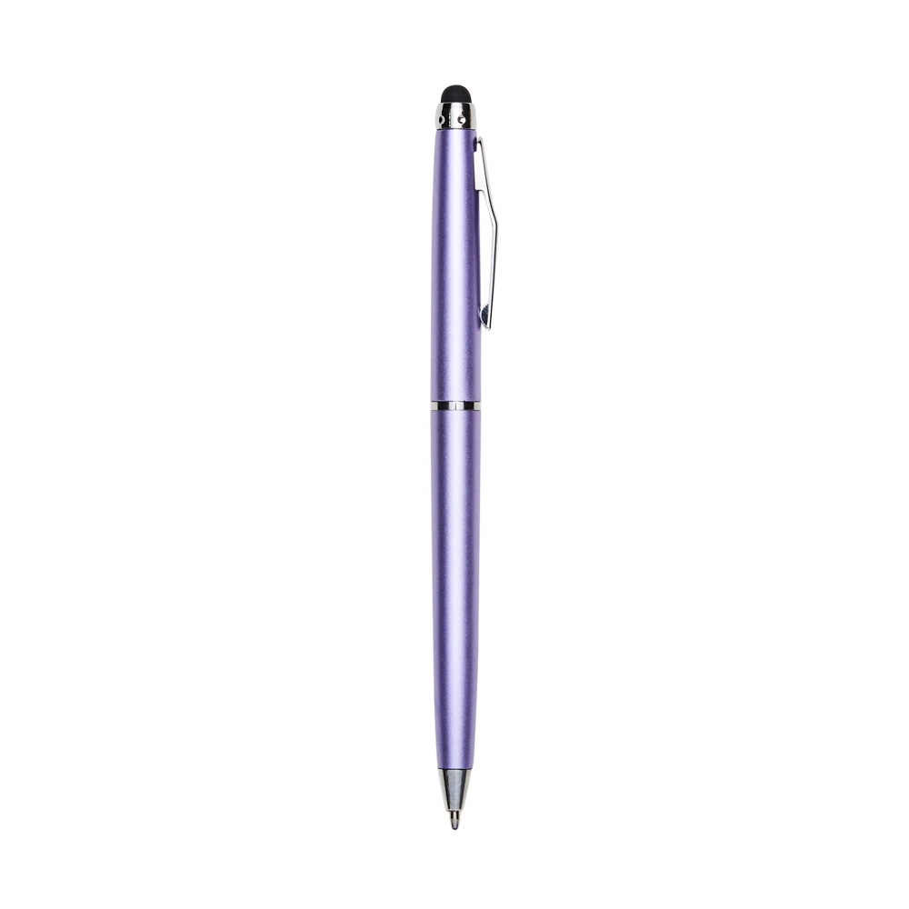 Caneta plástica touch screen com acionamento por rotação e carga esferográfica azul 1mm.