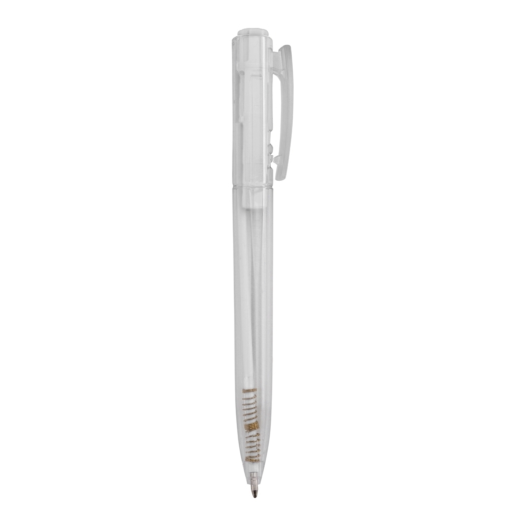 Caneta plástica com carga esferográfica azul e acionamento por clique.