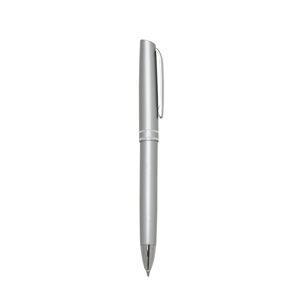 Caneta semimetálica, carga esferográfica azul e acionamento por clique.