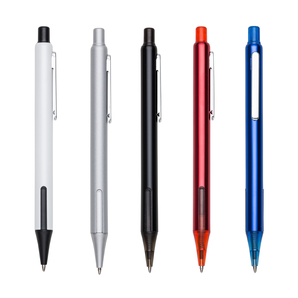 Caneta semimetálica com carga esferográfica azul e acionamento por clique. OBS.: PEDIDO APENAS MÚLTIPLO DE 50 PEÇAS!