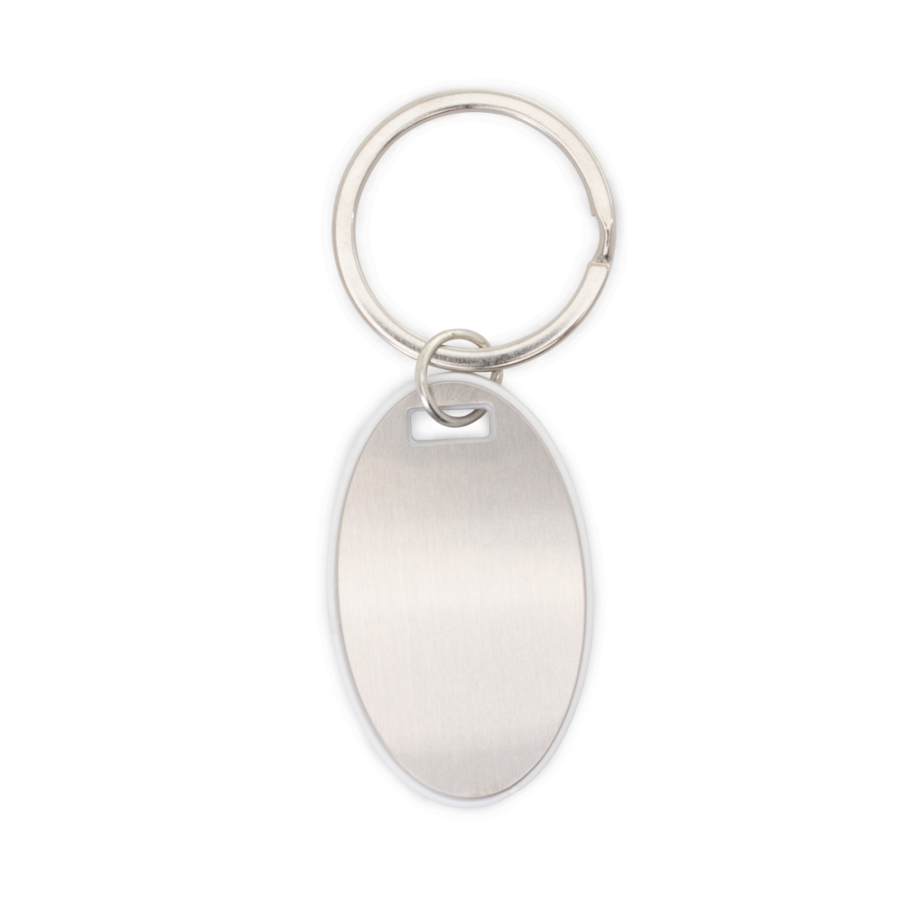Chaveiro com detalhe plástico e chapa metálica, personalizável frente e verso.