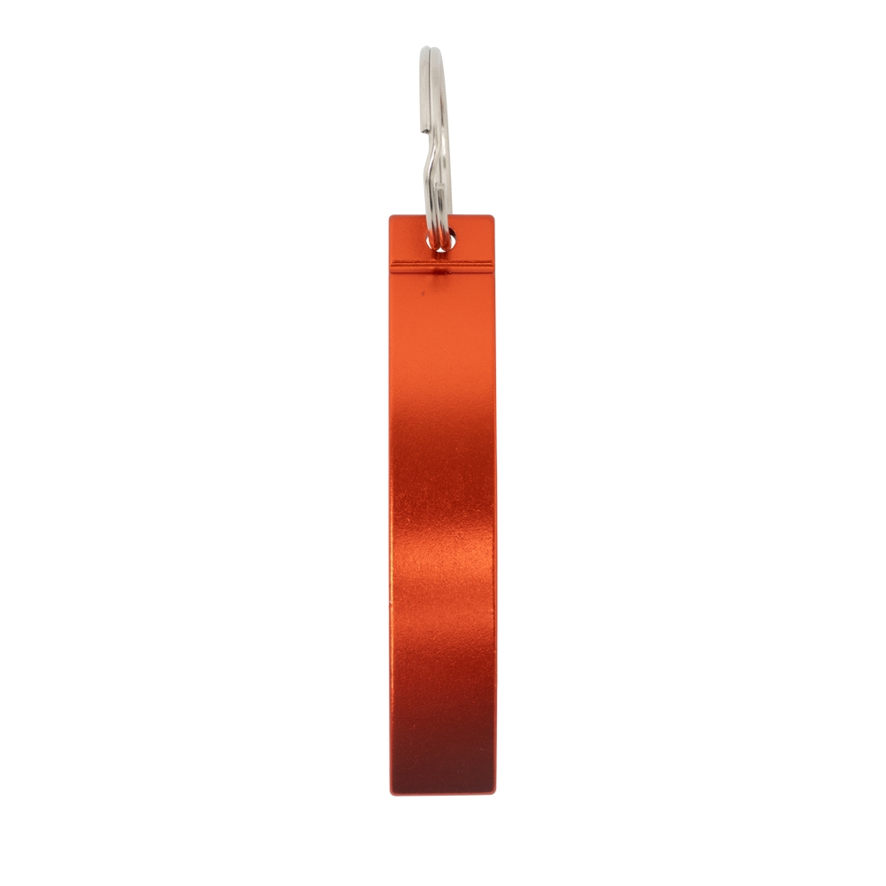 Chaveiro abridor metálico com acabamento brilhante.