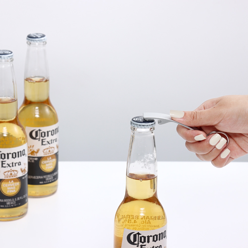 Chaveiro abridor metálico com acabamento fosco.