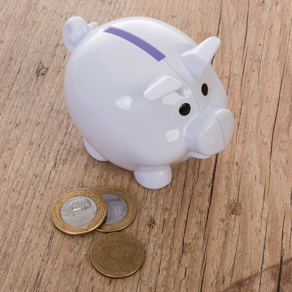 Cofre plástico resistente formato porquinho na cor branca. Para abri-lo basta rotacionar o compartimento na parte inferior conforme indicam as setas.