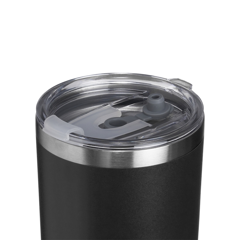Copo térmico de inox com capacidade de 550ml, contém tampa acrílica com bocal e trava de segurança e uma pequena tampa emborrachada para dissipação da temperatura.
