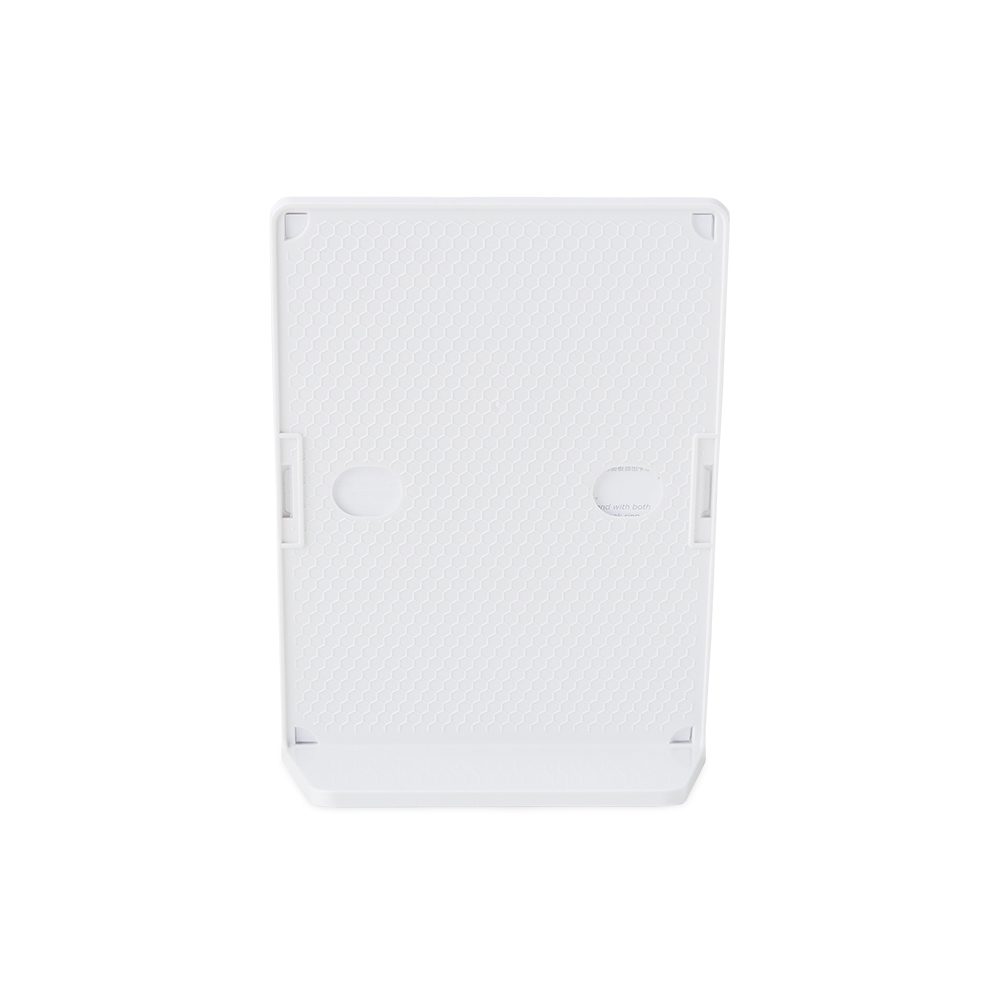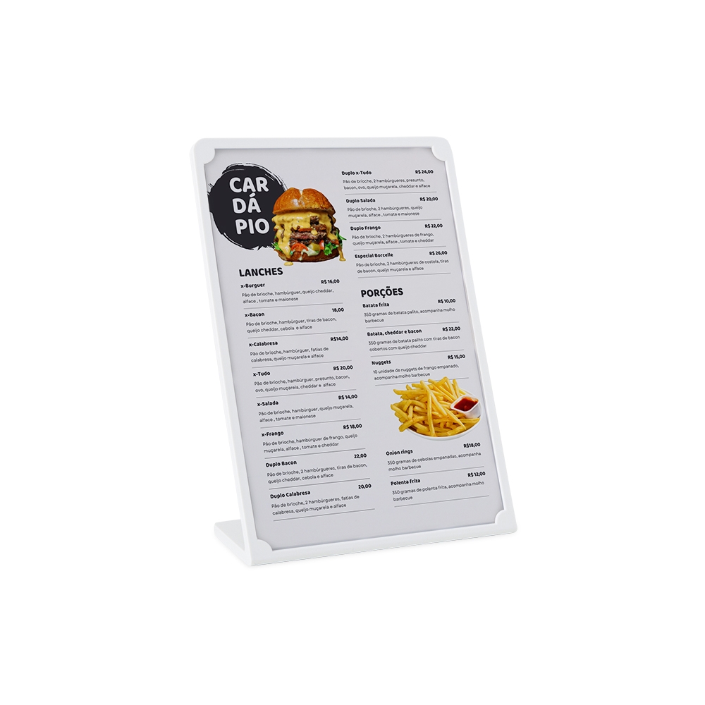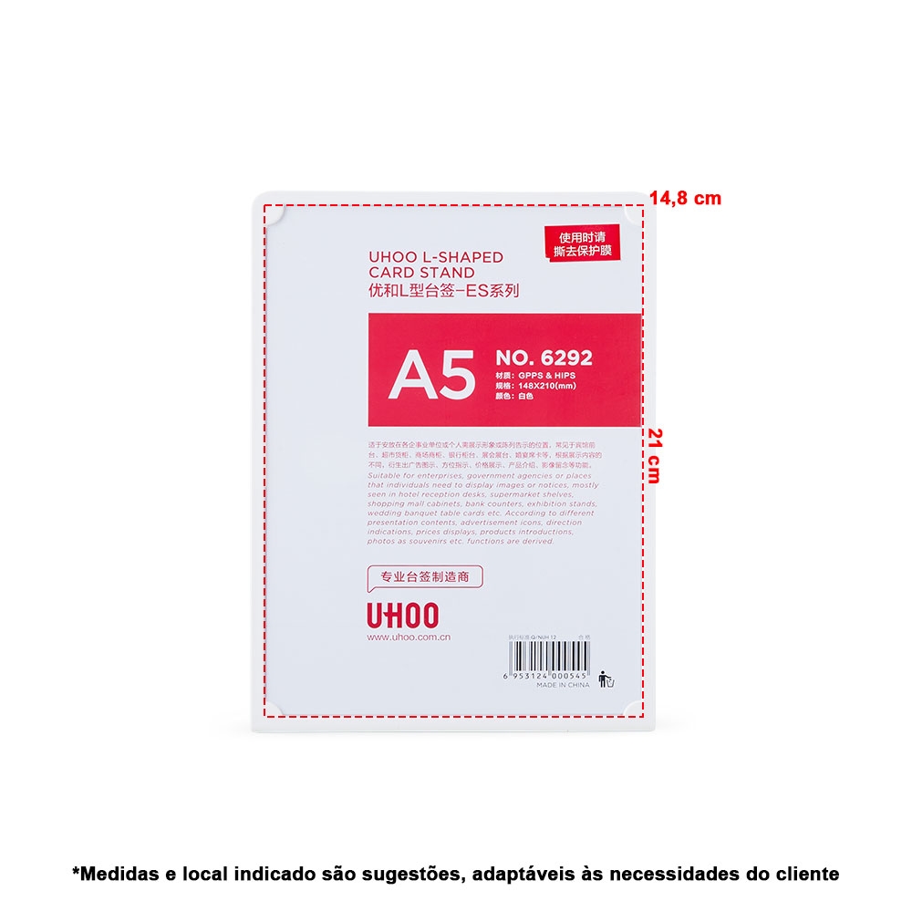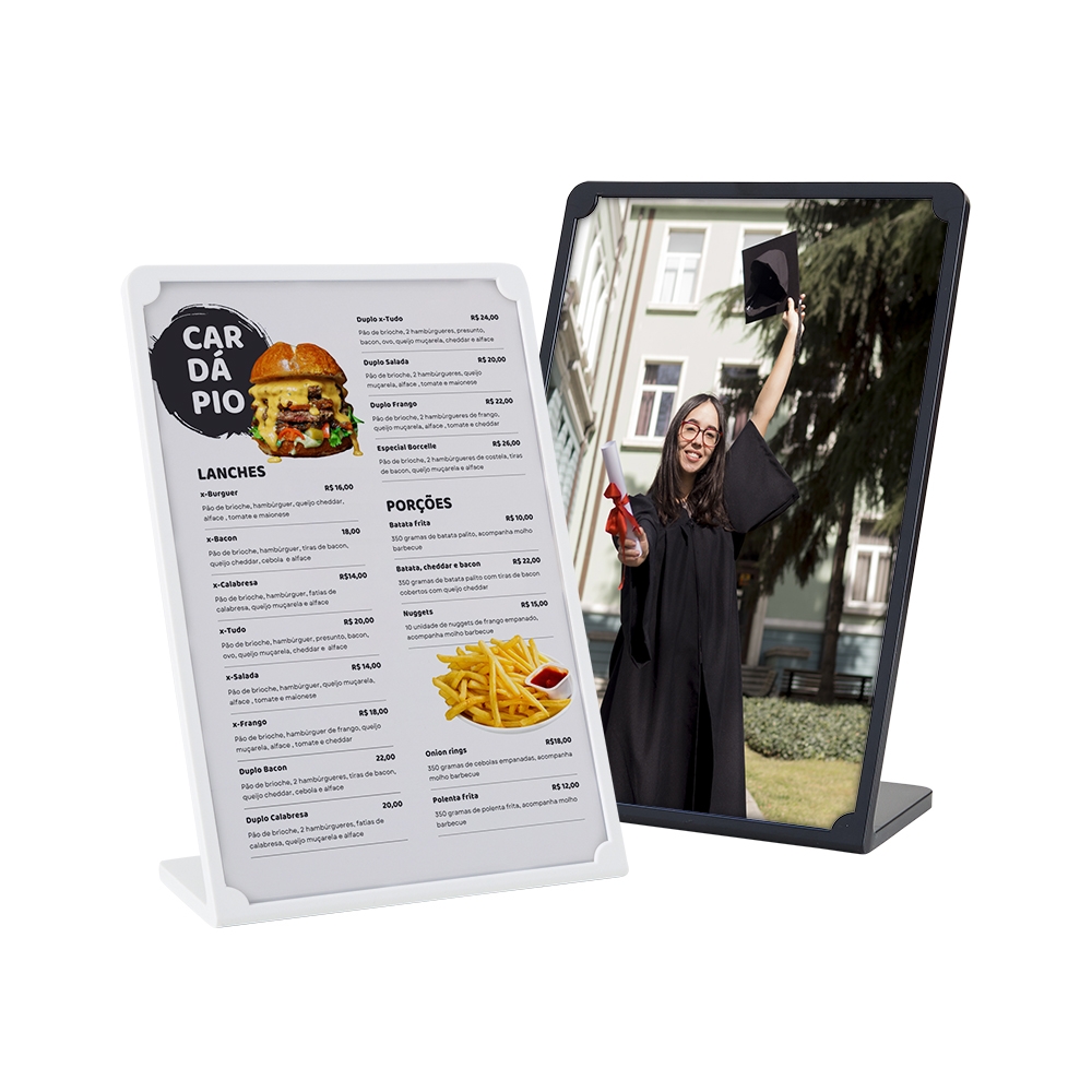Expositor porta retrato A5 feito em poliestireno com placa acrílica.