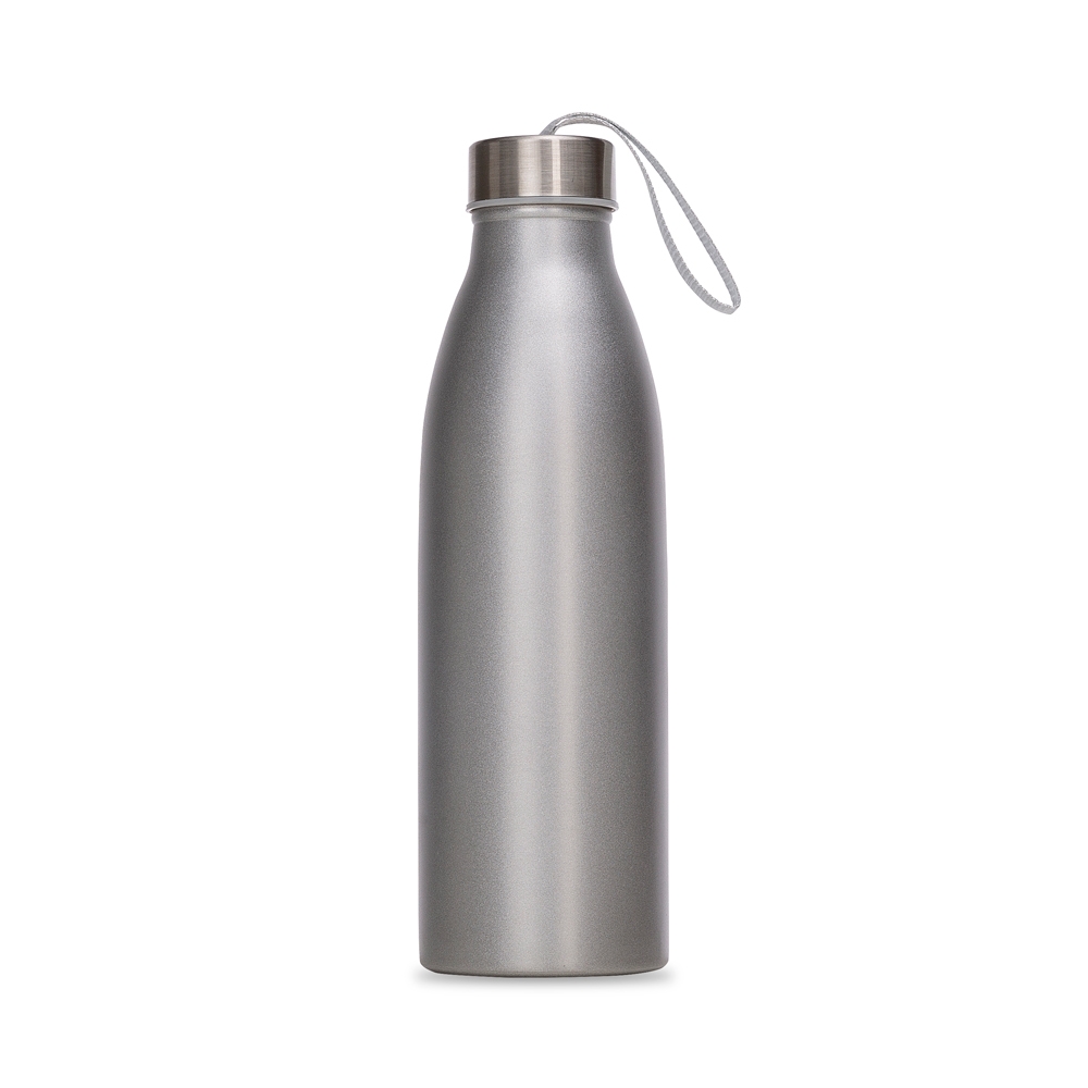 Garrafa de inox 750ml com tampa rosqueável e alça de nylon embutida.