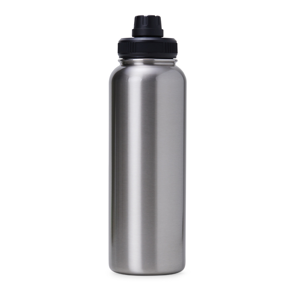 Garrafa térmica feita em inox com parede dupla livre de BPA, capacidade de 1,2 litros. Tampa com alça para transporte e tampa de proteção para o bocal.
