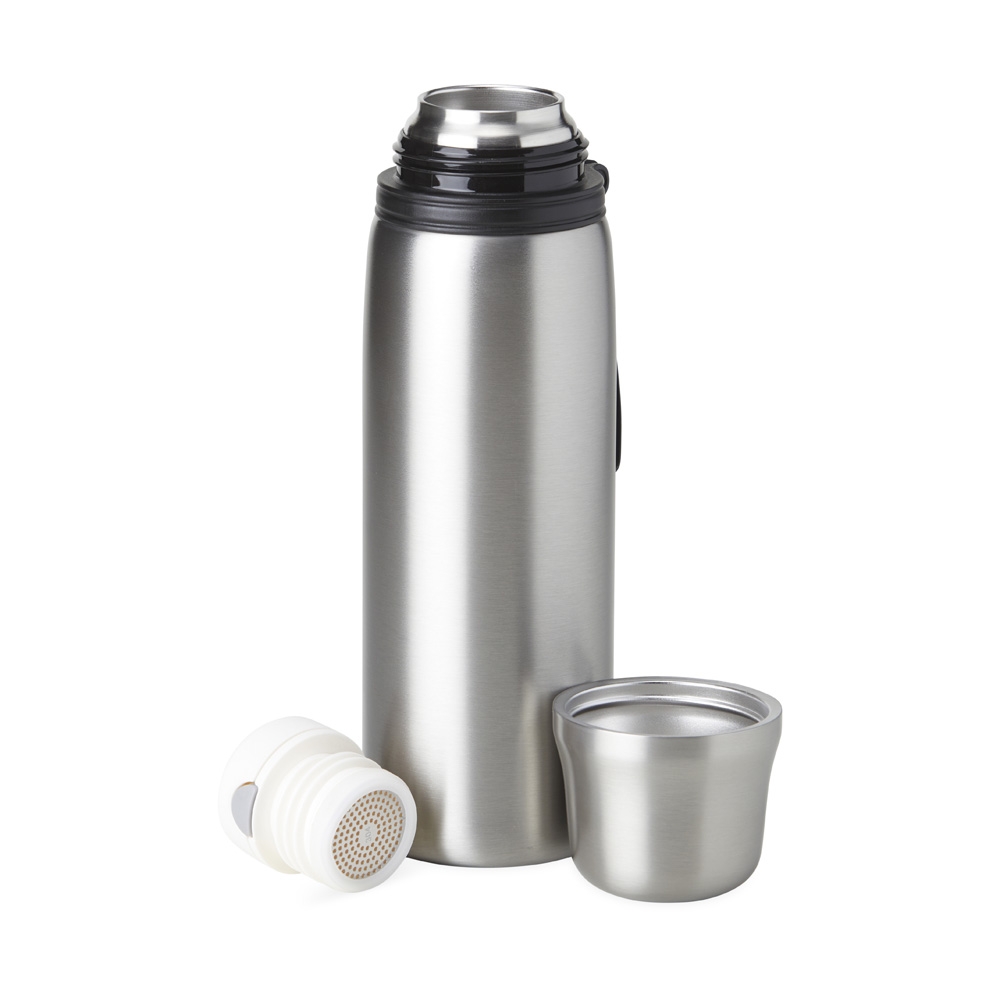 Garrafa térmica feita em inox 304 com parede dupla, capacidade de 850ml. Com alça emborrachada para transporte, a garrafa contém filtro infusor, tampa com botão de acionamento e tampa externa utilizável como copo.