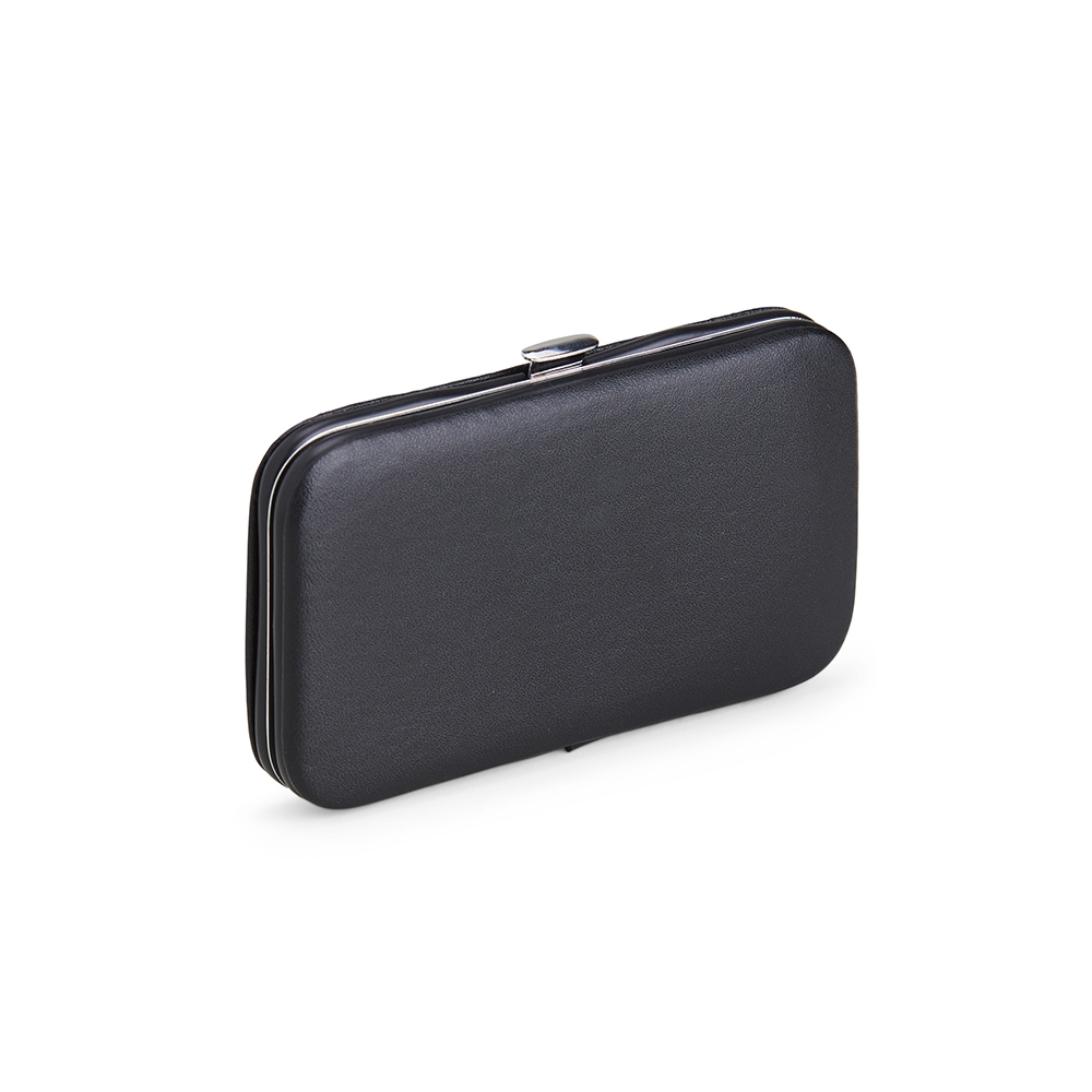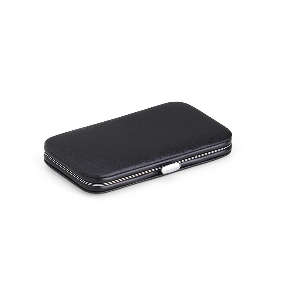 Kit manicure 7 peças em estojo de couro sintético. Possui: dois cortadores de unhas, tesoura, lixa, pinça, empurrador de cutícula e palito de unha. Parte interna de TNT com suporte de couro sintético para fixar as peças. Para abrir o estojo basta apertar o botão central.