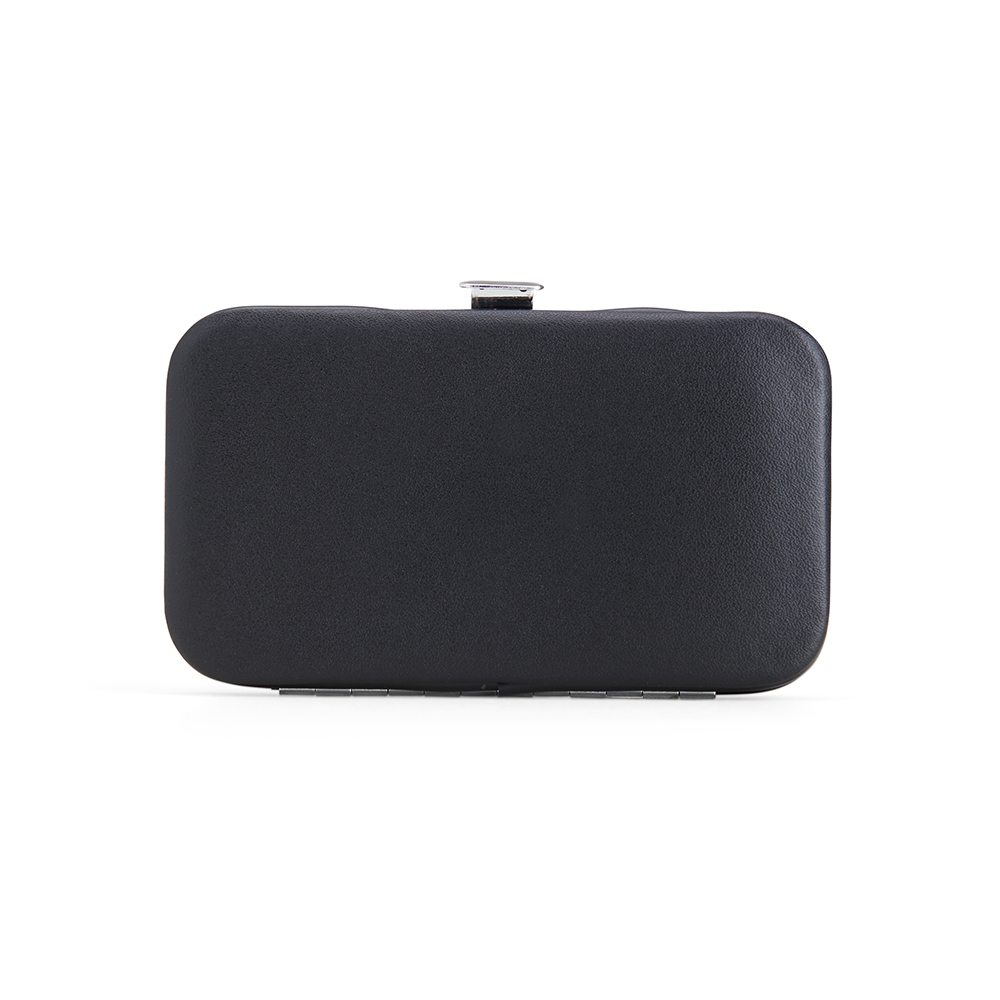 Kit manicure 7 peças em estojo de couro sintético. Possui: dois cortadores de unhas, tesoura, lixa, pinça, empurrador de cutícula e palito de unha. Parte interna de TNT com suporte de couro sintético para fixar as peças. Para abrir o estojo basta apertar o botão central.