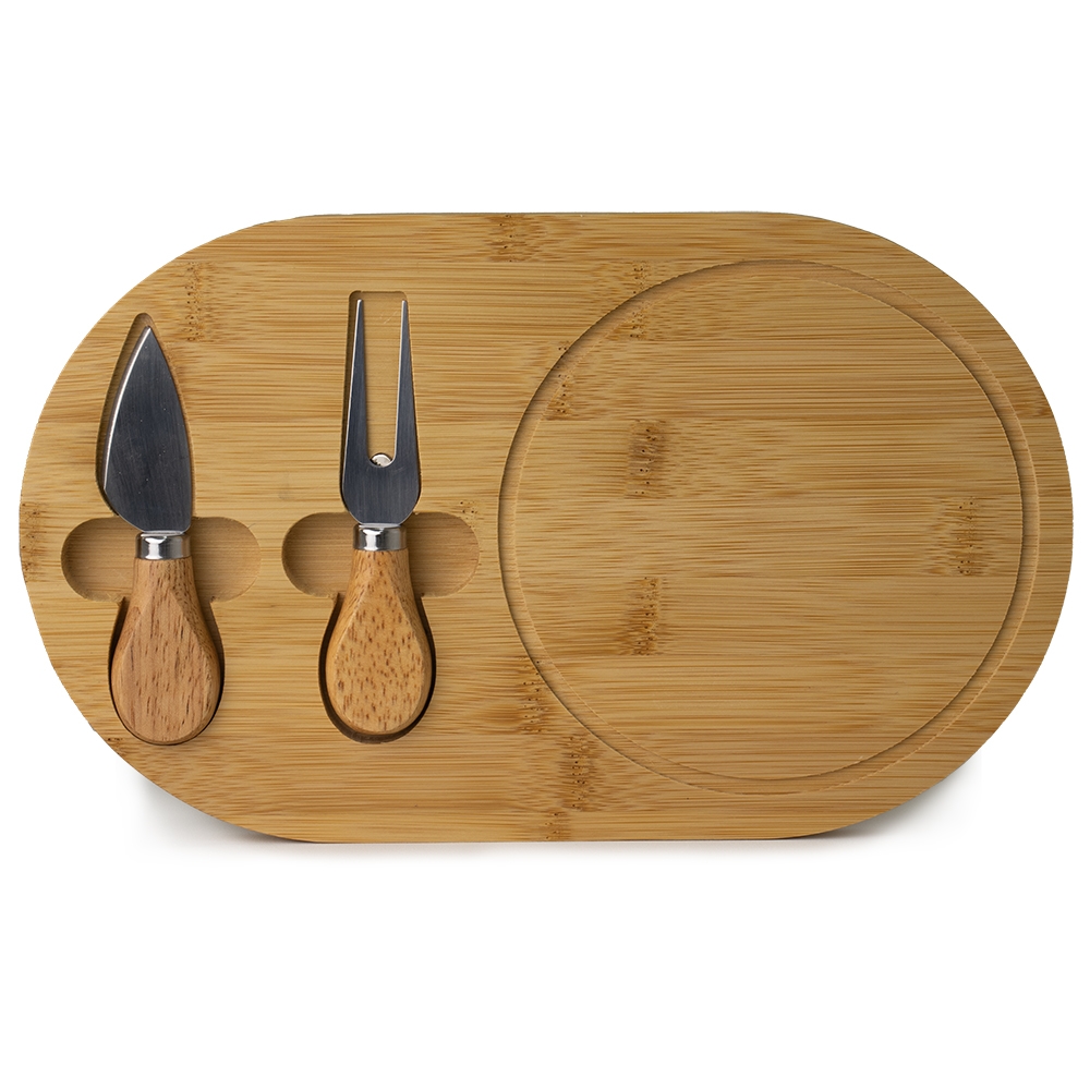 Kit queijo 3 peças, contém: tábua de bambu canaleta, faca com ponta, garfo e espátula. Tábua com imã para encaixe e fixação dos utensílios.
