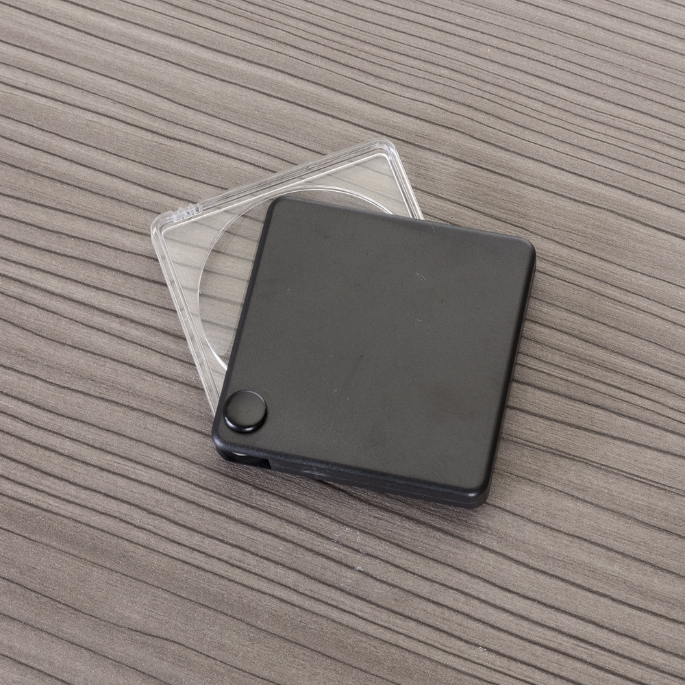 Lupa com capa plástica preto, basta rotacionar a lupa para poder utilizá-la.