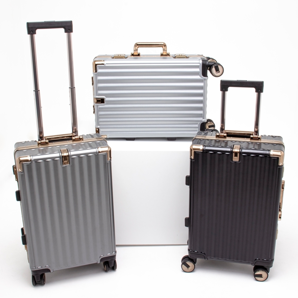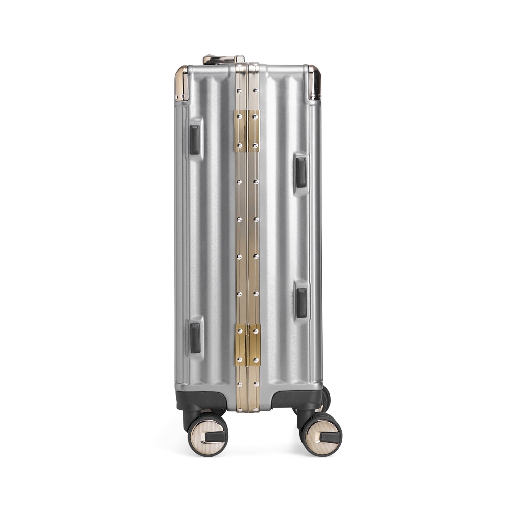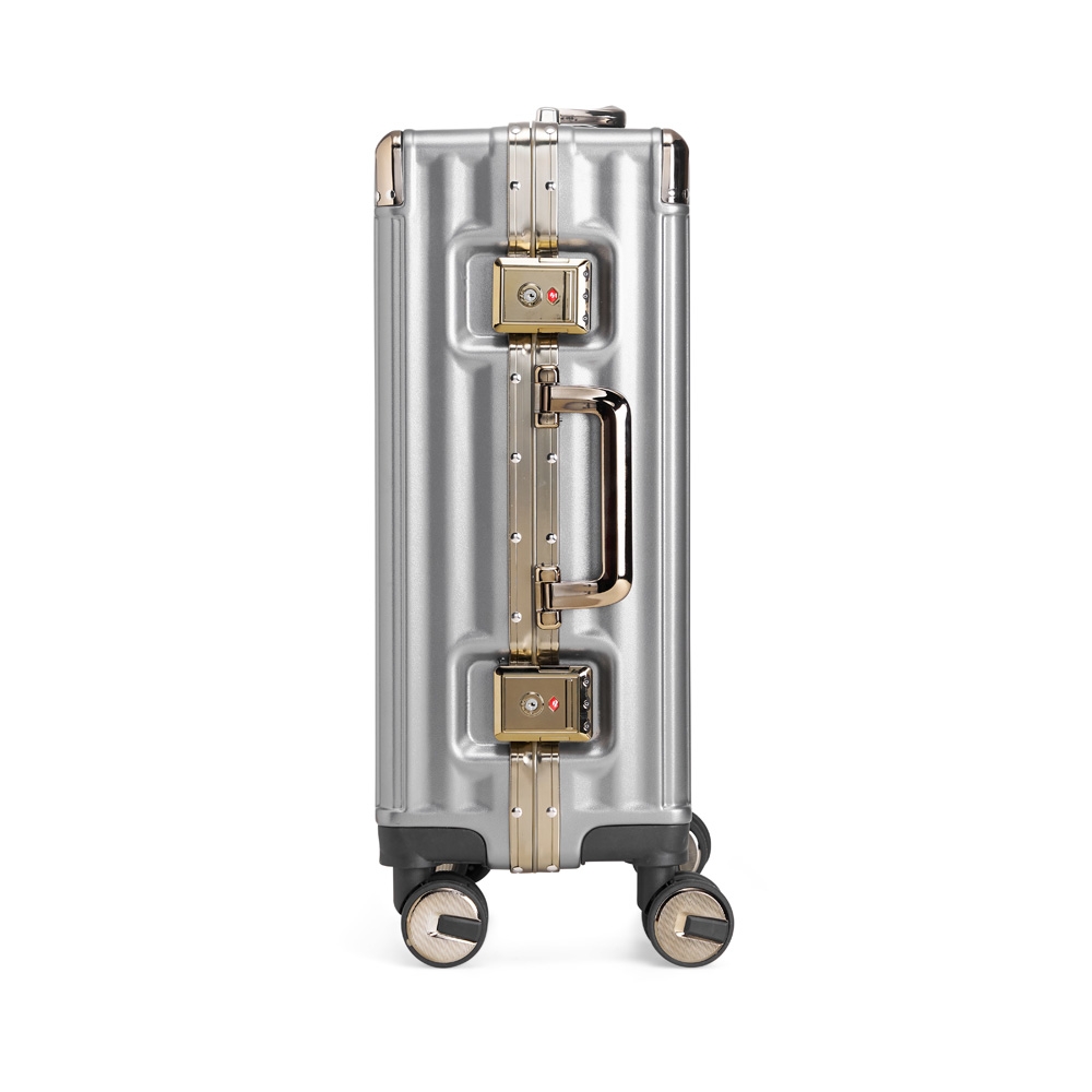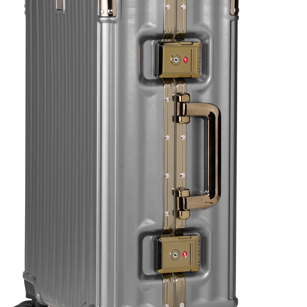 Mala de viagem 38 litros feita em plástico com acabamento em alumínio, contém cadeado numérico TSA. Compartimentos internos com bolso telado, bolso plástico para itens molhados e cinta compressora para roupas. A mala possui duas alças de mãos, puxador retrátil com regulagem de tamanho, suporte porta bolsa, quatro rodinhas 360º e apoios laterais.