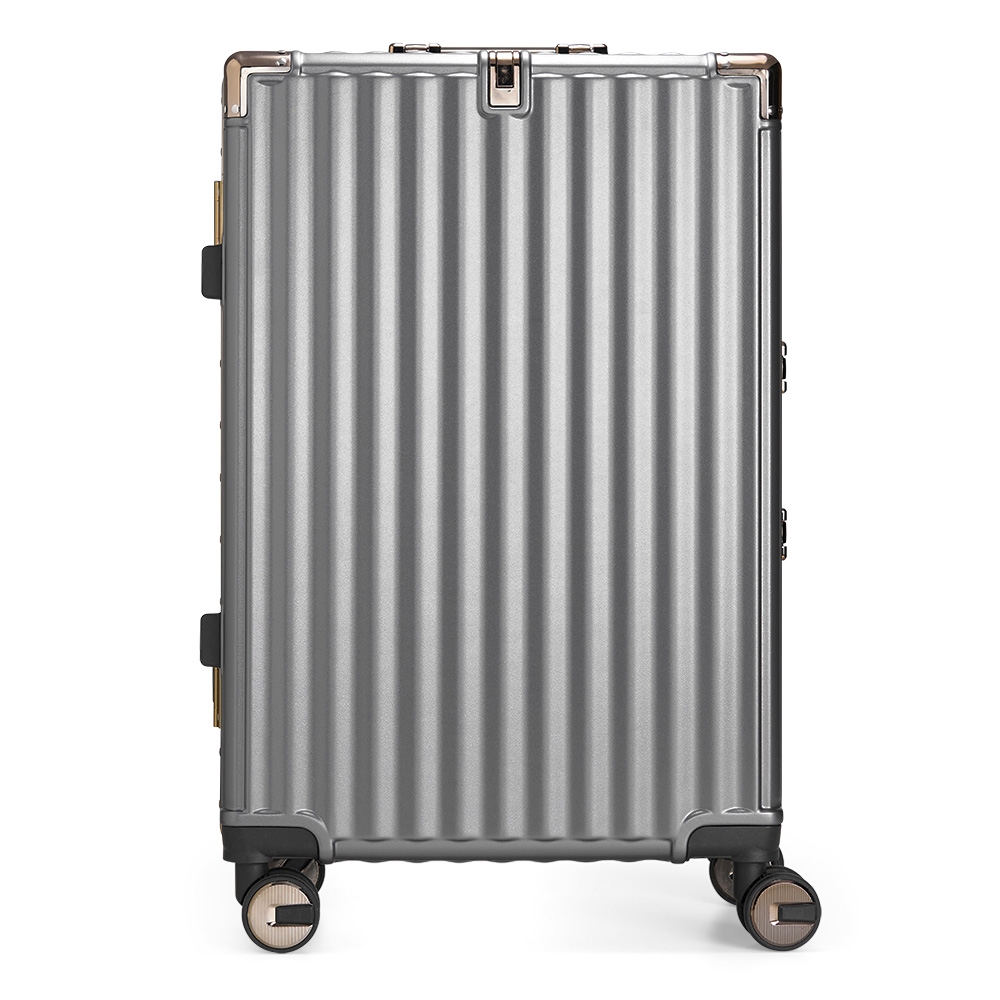 Mala de viagem 68 litros feita em plástico com acabamento em alumínio, contém cadeado numérico TSA. Compartimentos internos com bolso telado, bolso plástico para itens molhados e cinta compressora para roupas. A mala possui duas alças de mãos, puxador retrátil com regulagem de tamanho, suporte porta bolsa, quatro rodinhas 360º e apoios laterais.