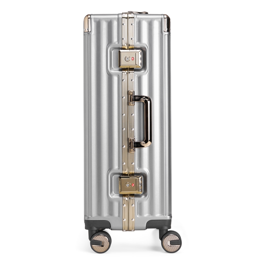 Mala de viagem 68 litros feita em plástico com acabamento em alumínio, contém cadeado numérico TSA. Compartimentos internos com bolso telado, bolso plástico para itens molhados e cinta compressora para roupas. A mala possui duas alças de mãos, puxador retrátil com regulagem de tamanho, suporte porta bolsa, quatro rodinhas 360º e apoios laterais.