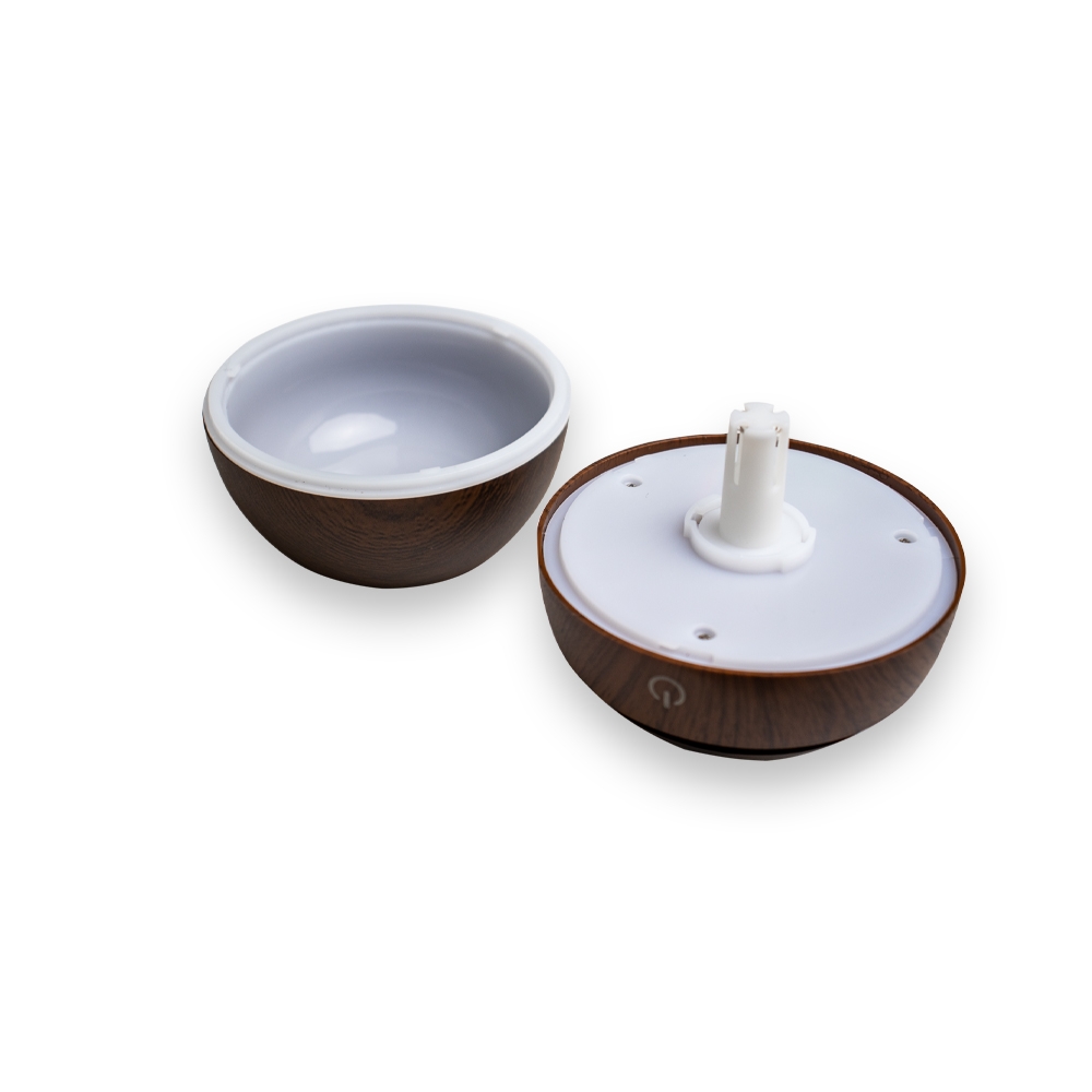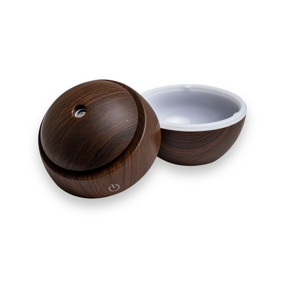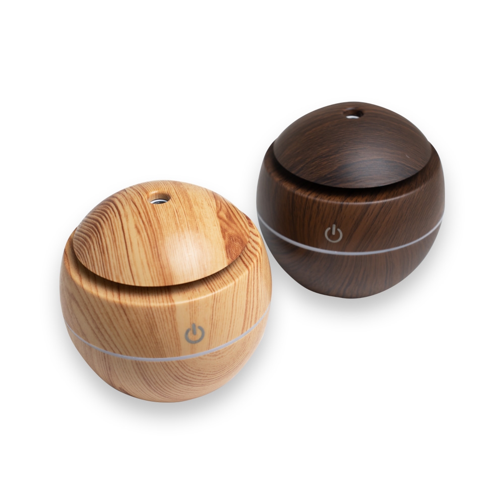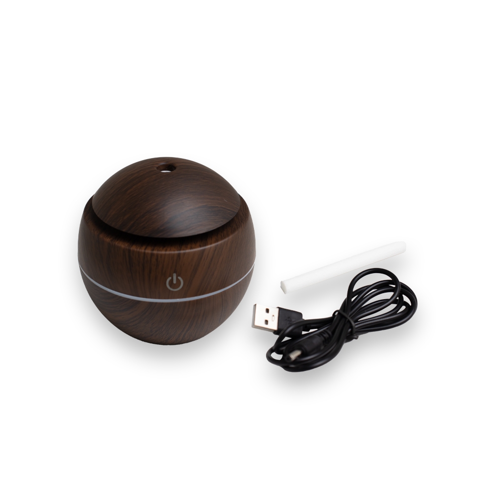 Mini umidificador ultrassônico com led que muda de cor. Acompanha filtro de algodão e um cabo USB. Capacidade para 130ml de água. Produzido em plástico e revestido por adesivo caracterizando madeira. Taxa de tensão DC5V e Taxa de consumo de 2W. O produto não retém energia, funciona somente com o cabo USB conectado a um meio de alimentação de energia. Obs.: para conservação do produto é recomendável utilizar água filtrada e não deve ser usado essências!