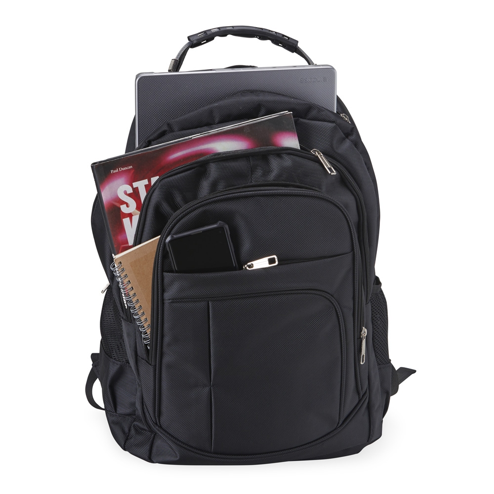 Mochila de nylon 30 litros com quatro compartimentos, sendo o principal com bolso para notebook 15,6. A mochila possui bolsos laterais em malha, duas alças de mãos e área costada com revestimento espumado.