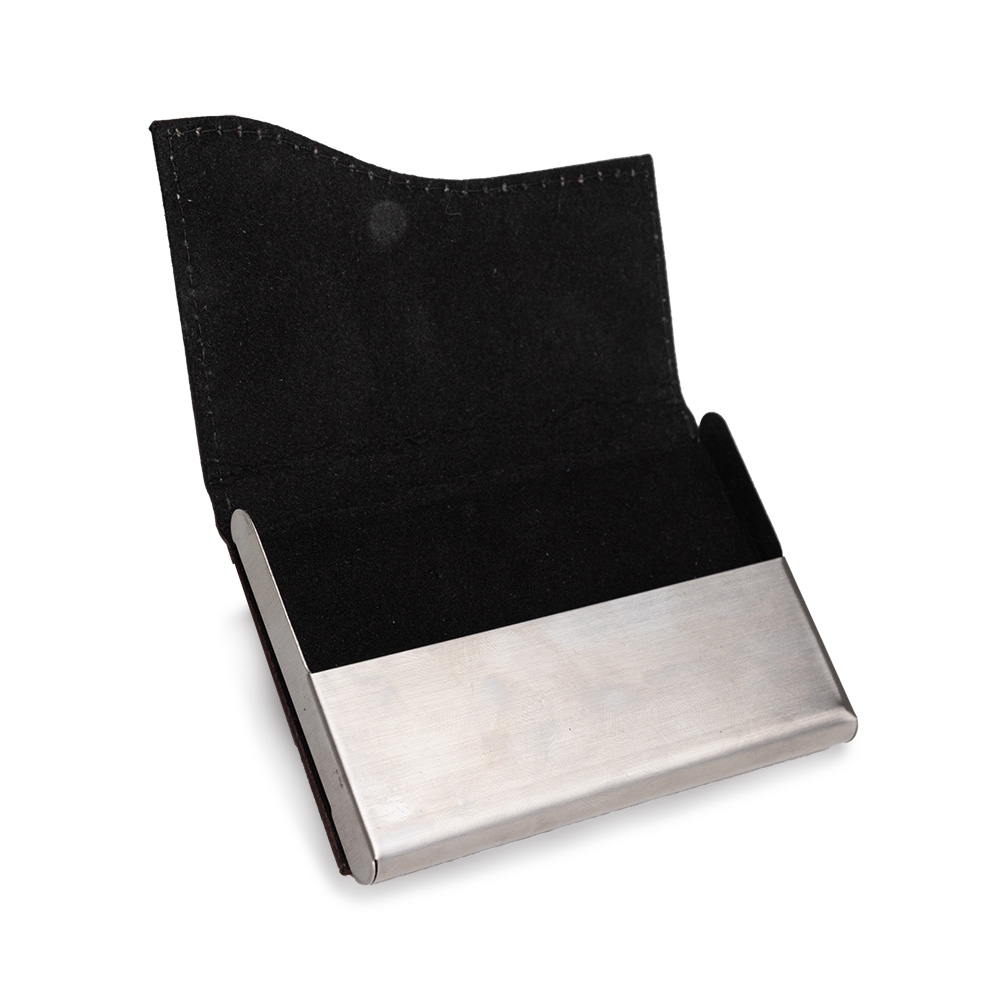 Porta cartão em couro sintético e metal. Possui parte interna revestida com veludo e fechamento magnético.